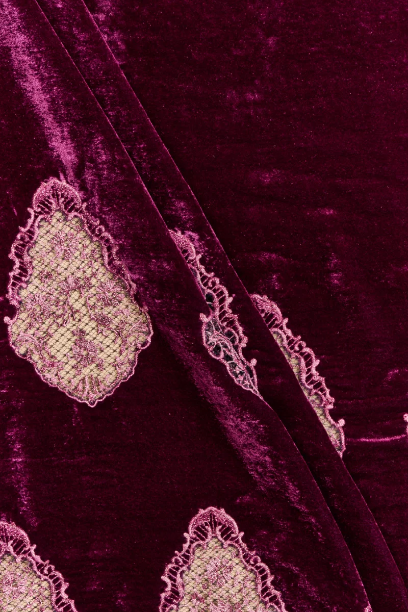Włoski, ekskluzywny welur w kolorze wina ozdobiony różowo czarną koronką z błyszczącą złotą nitką. Tkanina jest miękka, lejąca, nieelastyczna, cienka ale kryjąca. Pięknie się układa, a haftowane zdobienia ułożone w dwóch rzędach nadają tkaninie wyjątkowy i niepowtarzalny wygląd. Koronkowe elementy o wysokości 17 cm, szerokości 11 cm, powtarzają się co 15 cm - tkaninę szyjemy obwodowo. Cudowna propozycja do stworzenia eleganckiej sukienki, spódnicy lub bluzki.