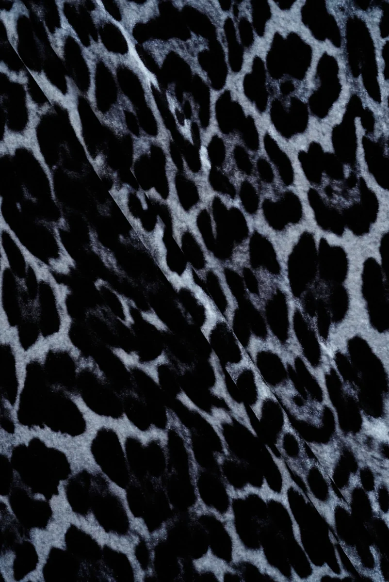 Włoska tkanina welurowa utkana z wiskozy i jedwabiu naturalnego z motywem czarnej panterki na tle w kolorze szarym. Wzór jest położny gęsto, a pojedyncze plamki mają od 1 cm do 6 cm szerokości i często stykają się ze sobą. Tkanina jest lejąca, kryjąca, nieelastyczna i miękka. Delikatny połysk sprawia, że tkanina wygląda bardzo elegancko. Interesująca propozycja z której można uszyć sukienki, bluzki i spódnice.