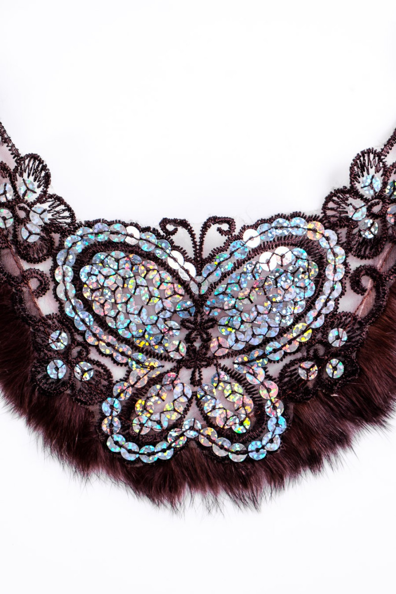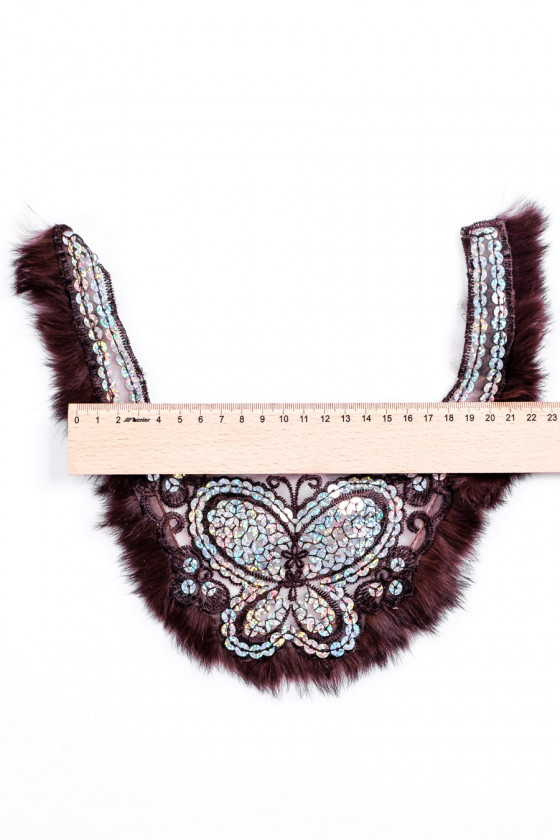 Aplikacja motyl dekolt - wyszywana cekinami z naturalnym futerkiem w kolorze brązu. Wysokość 25 cm, szerokość 10 - 28 cm.