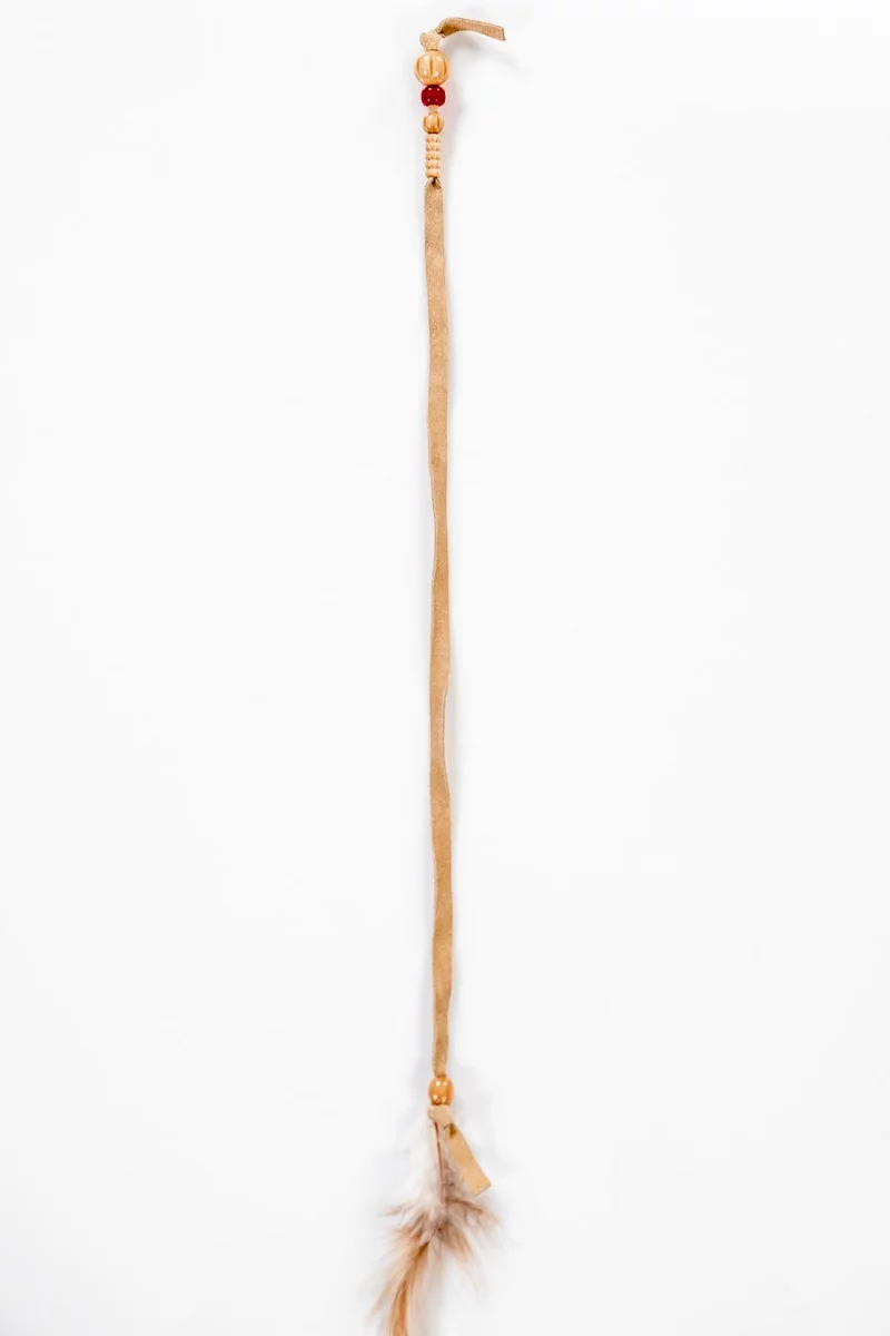 Włoska aplikacja w formie rzemyka z beżowego zamszu z drewnianymi koralikami, zakończona naturalnym piórkiem.