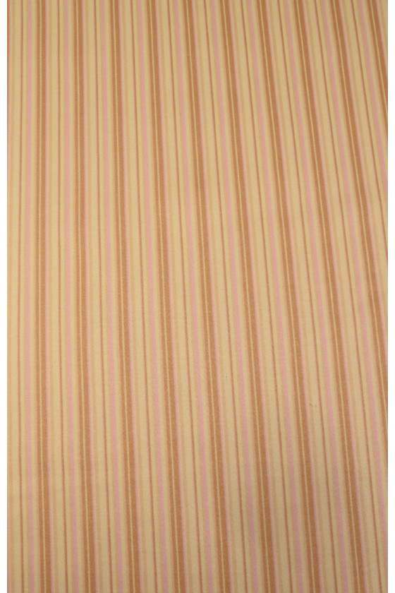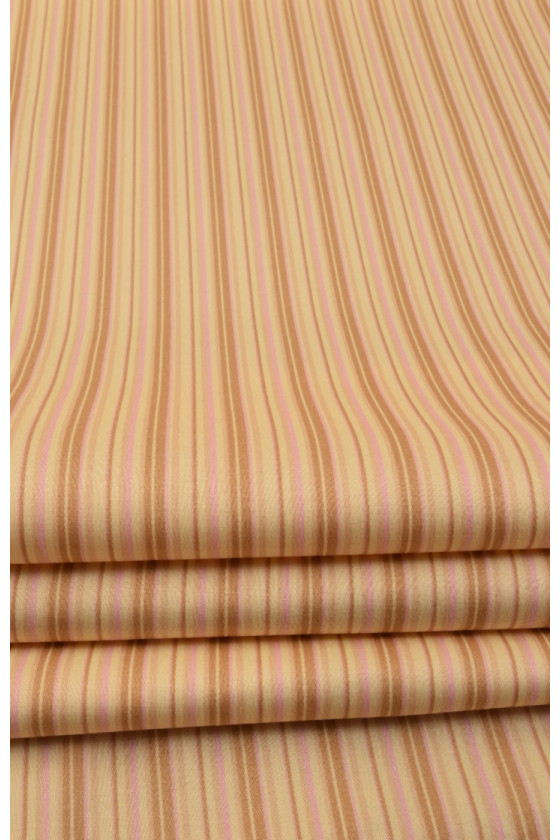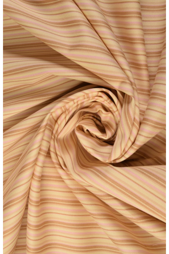 Bawełna elastyczna to naturalna tkanina, którą można wykorzystać do uszycia bardziej dopasowanych ubrań letnich. Dodatek elastanu dodatkowo stabilizuje tkaninę. Kolorystyka : Na jasno-żółtym tle paski beżowe i różowe