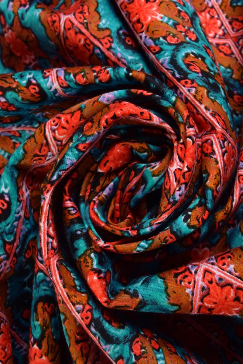 Kolorowa bawełna, lekko elastyczna. Ornamentowy, kolorowy wzór umieszczony w rombach. Kolorystyka: turkus, brąz i jasna czerwień. Propozycja do uszycia letnich sukienek, spódnic, spodni