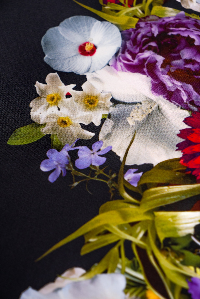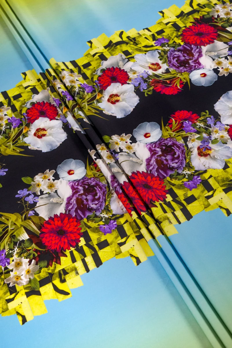 Włoska tkanina bawełniana z elastanem typu cadi. Tkanina cieniowana (żółto-niebieska) z kwiatowo-geometrycznym pasem na środku (szerokość 55 cm). Tkanina typu cadi jest kryjąca, mięsista, spływająca (ciężka).
