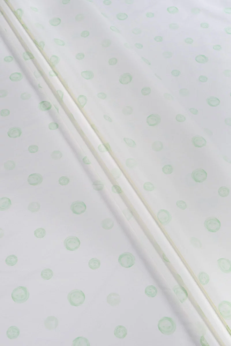 Włoska tkanina bawełniana z domieszką elastanu w kolorze śmietanowym z motywem zielonych, rozmytych groszków (2 - 3 cm). Tkanina mięsista, matowa, elastyczna, lekko sztywna.