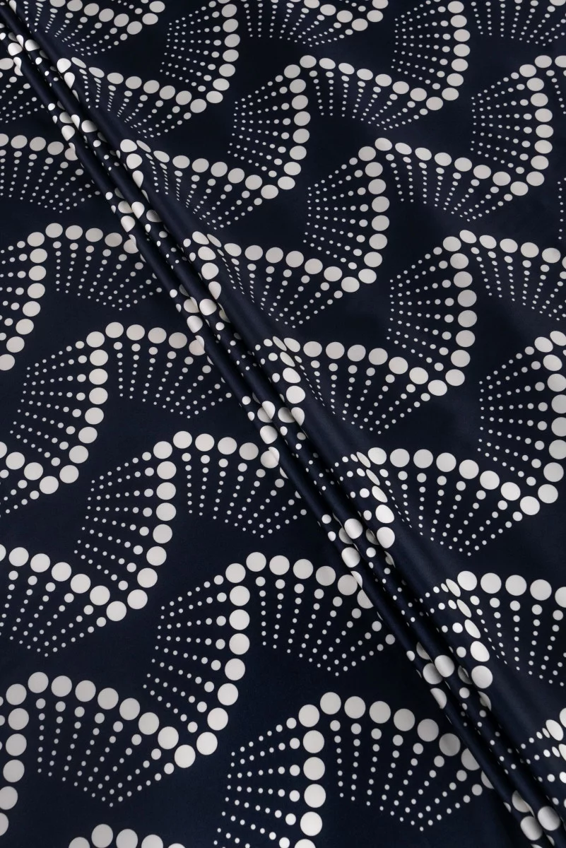 Włoska bawełna elastyczna w kolorze ciemnego granatu z motywem nieregularnych groszków w kolorze śmietanowym. Bawełna to w 100% naturalne włókno.