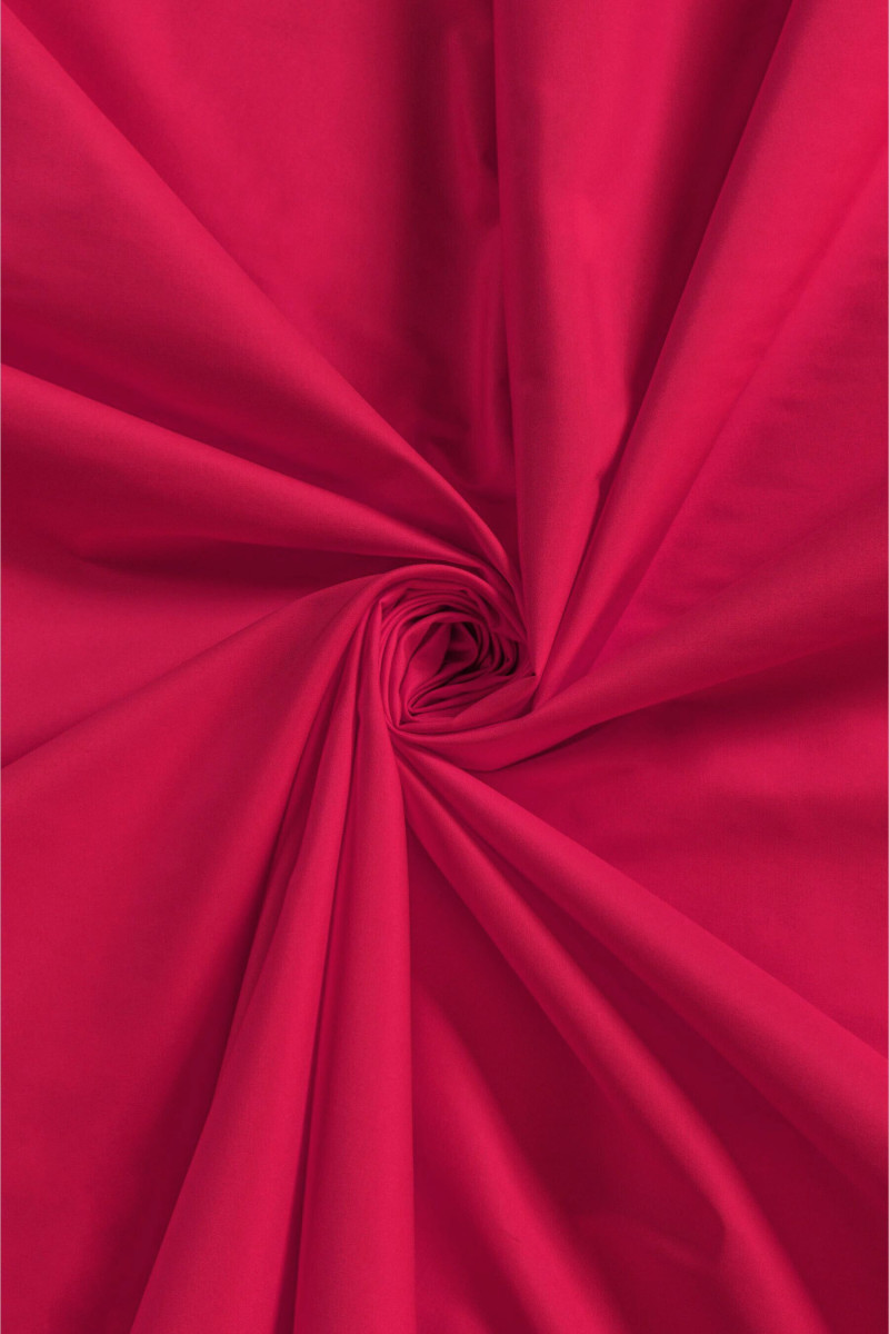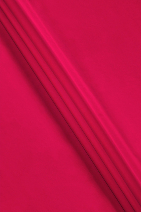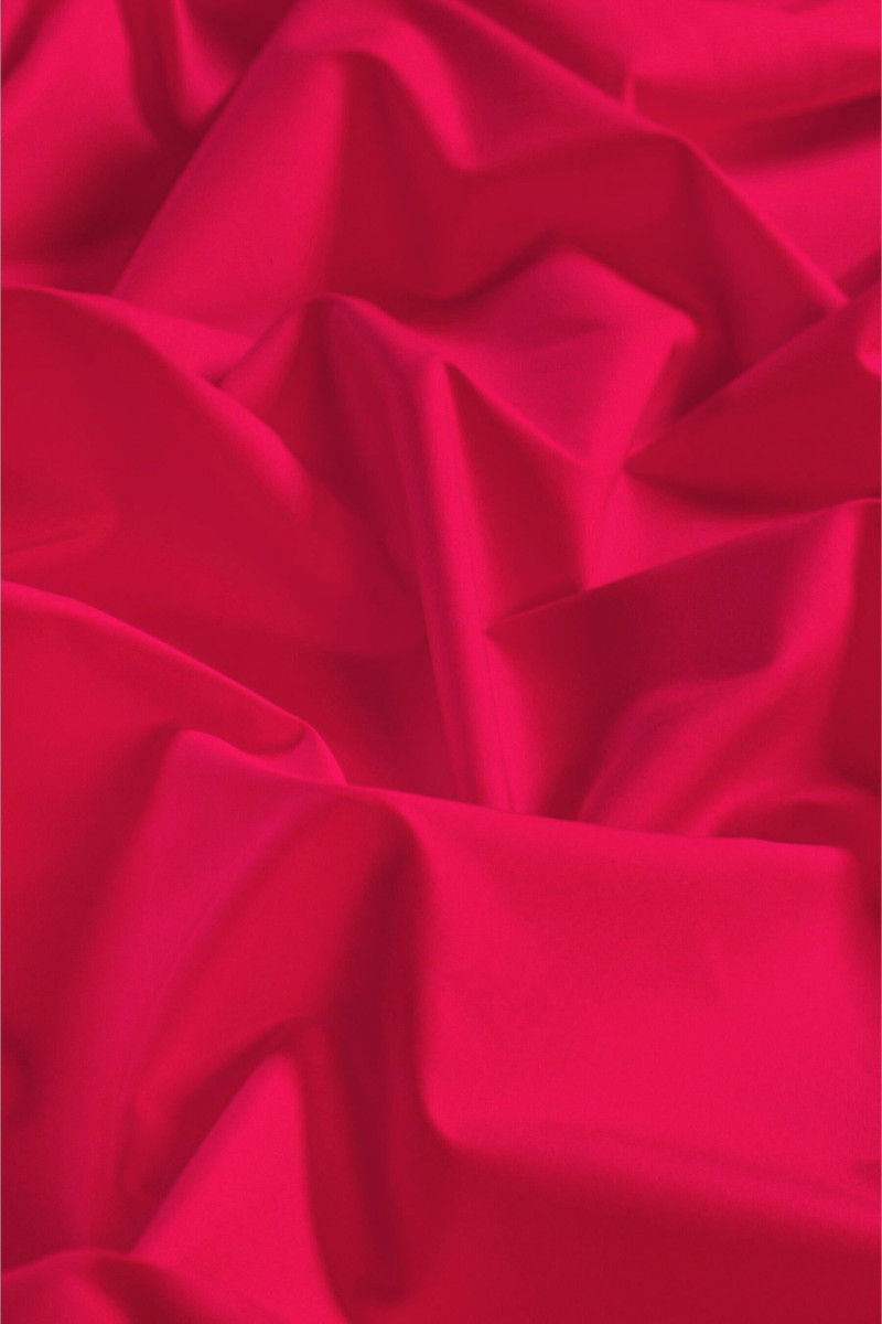 Włoska tkanina bawełniana z dodatkiem elastanu w kolorze malinowego różu. Tkanina elastyczna o gładkim splocie z delikatnym połyskiem, lekko sztywna.
