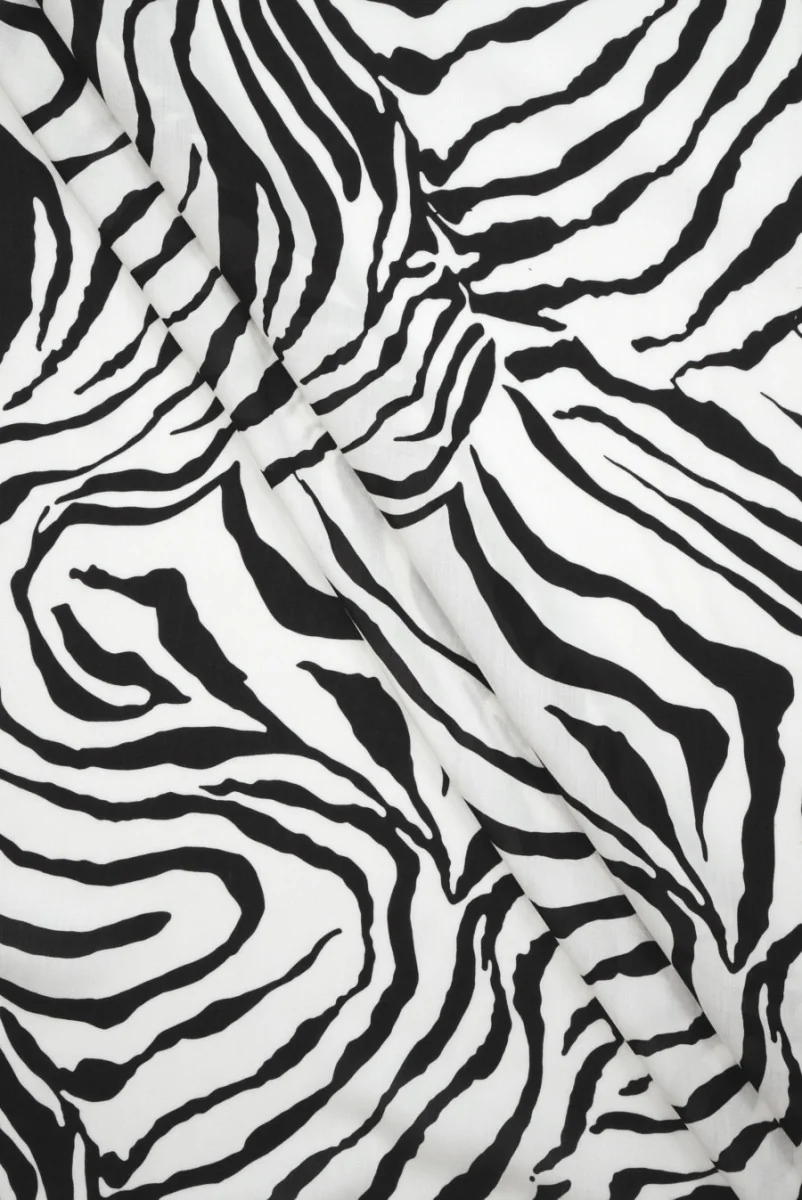 Włoska tkanina 100% bawełniana z motywem czarnej zebry na śmietankowym tle. Ponadczasowy zwierzęcy wzór w klasycznych kolorach. Tkanina o gładkim splocie, cienka, lekko transparentna, zwiewna i nieelastyczna. Idealnie nada się na bluzki, koszule, a także letnie sukienki i spódnice, do których zalecamy użycie podszewki.