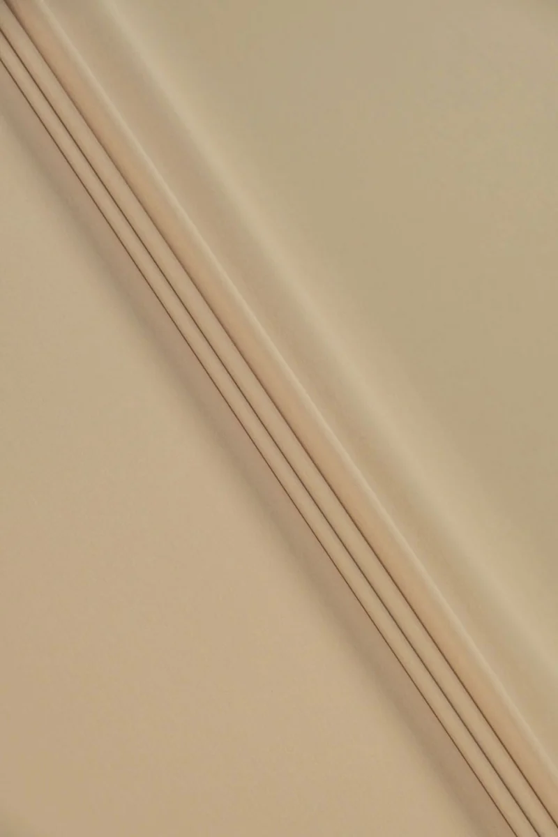 Włoska tkanina bawełniana z dodatkiem elastanu w kolorze ciepłego beżu. Tkanina bardzo elastyczna o średniej grubości i matowym splocie z przeznaczeniem do uszycia sukienki, spódnicy lub spodni. Naturalna tkanina w bardzo dobrym gatunku, dodatek elastanu sprawia, że jest wygodniejsza w użytkowaniu i mniej się gniecie. Tkanina niezastąpiona w okresie wiosenno-letnim.