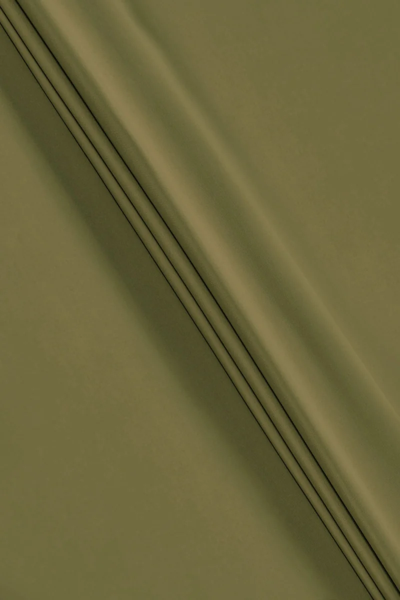 Włoska tkanina utkana z jedwabiu i bawełny typu batyst w kolorze khaki. Tkanina cienka ale kryjąca o gładkim, matowym splocie, nieelastyczna - bardzo przyjemna dla ciała. Idealna na letnie upały.