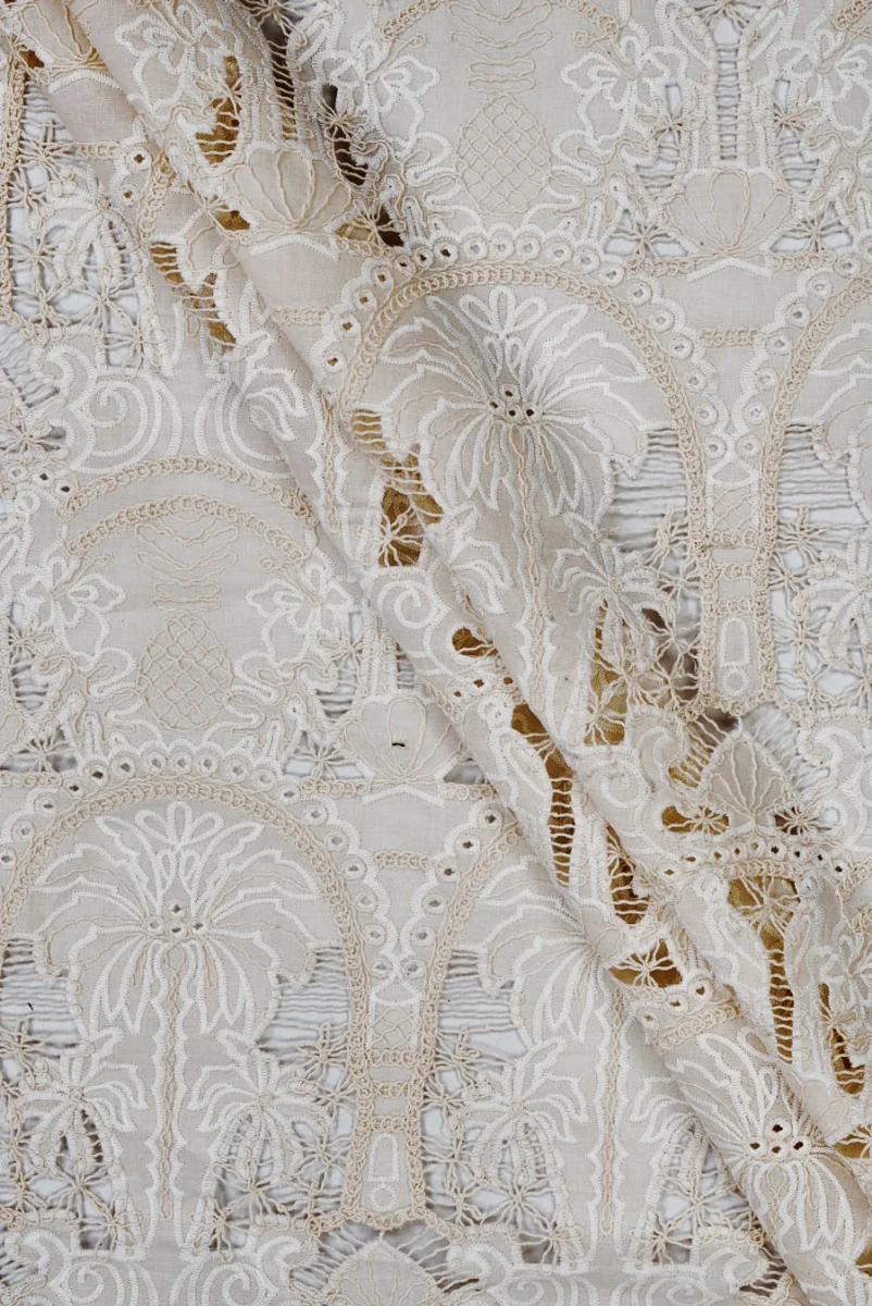 Haft wykonany na bawełnianym batyście w kolorze jasnego beżu z motywami palm, ananasów i muszli. Regularny i gęsty wzór składający się z śmietanowego haftu i jasno beżowego sznurka powtarza się co 15,5 cm i jest delikatnie wypukły, ze względu na kierunek wzoru zalecamy szycie obwodowe. Tkanina jest cienka, transparentna w poszczególnych częściach, nieelastyczna i matowa. Doskonale sprawdzi się na koszule, sukienki, spódnice a nawet szorty.