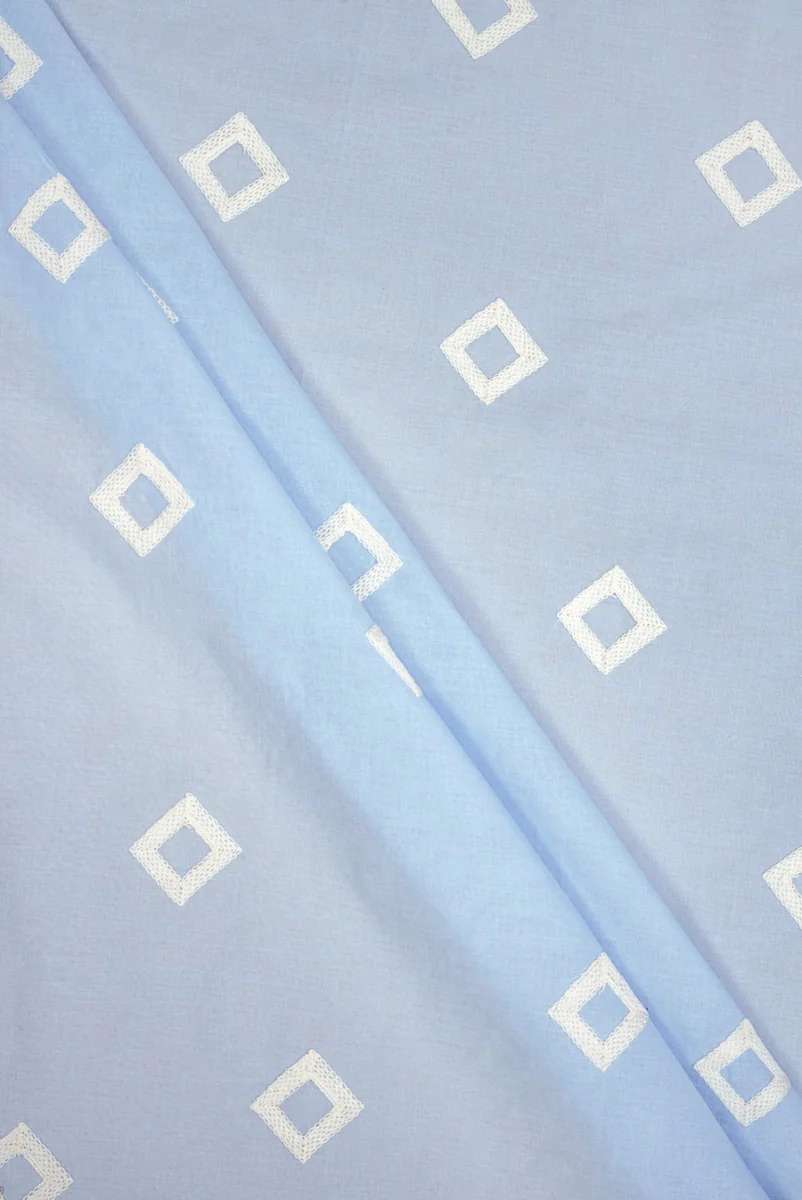 Włoska tkanina 100% bawełniana typu batyst w świeżym, błękitnym kolorze z geometrycznym, haftowanym motywem. Śmietanowy wzór przedstawiający romby położony jest nieregularnie w pewnych odległościach, dzięki czemu materiał nabiera ciekawej wyrazistości i kontrastu. Jeden element ma rozmiar 3 cm * 3 cm. Oba brzegi wykończone są śmietanowym, falowanym zębem. Tkanina jest miękka, nieelastyczna, cienka, ale dość dobrze kryjąca. Połączenie naturalnych włókien z precyzyjnym haftem na gładkim tle idealnie sprawdzi się na wakacyjne komplety typu bluzka + szorty oraz sukienki i spódnice z falbanami.