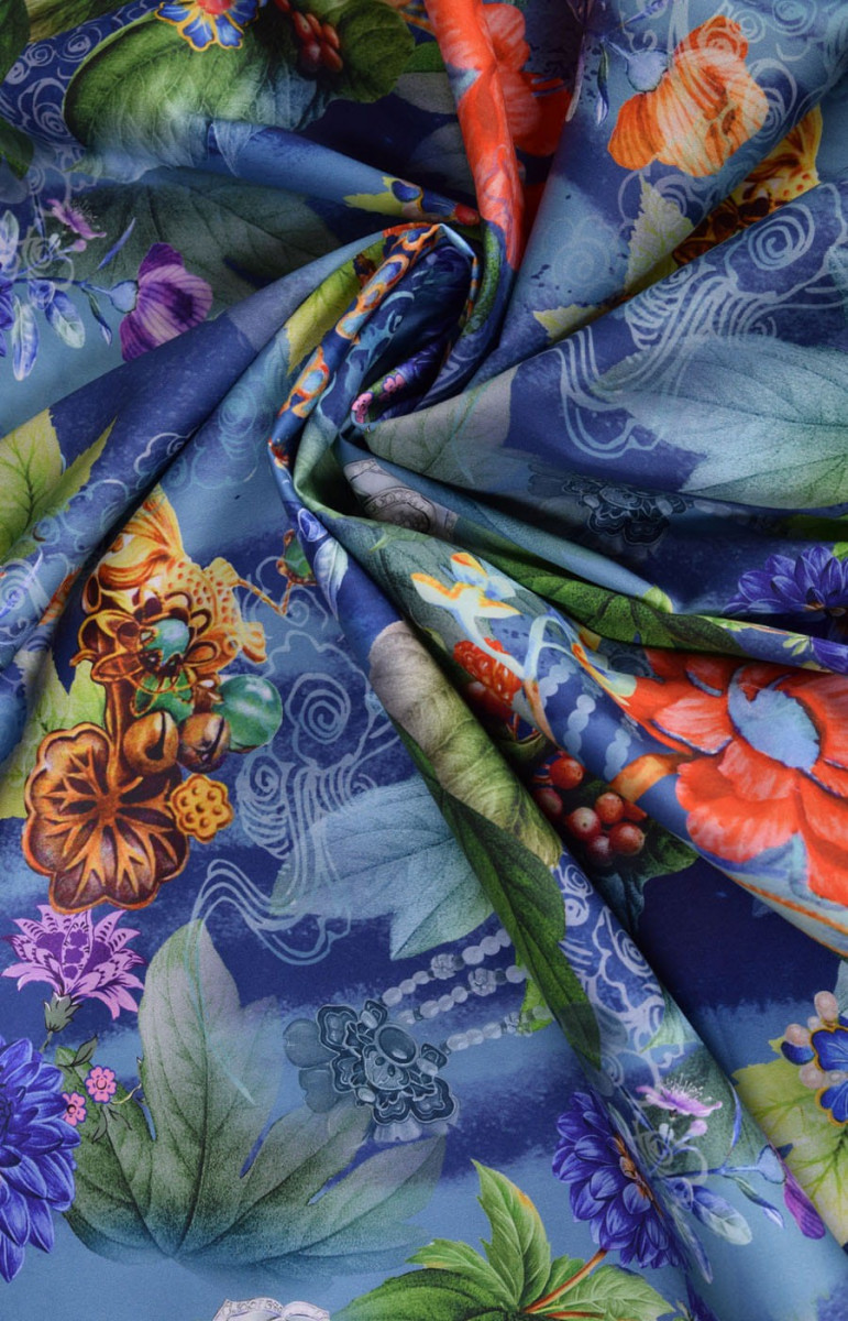 Cienka bawełna 100% o bardzo wyrazistym wzorze roślinnym. Tkanina nieelastyczna. Idealna na wzorzyste koszule lub sukienki.