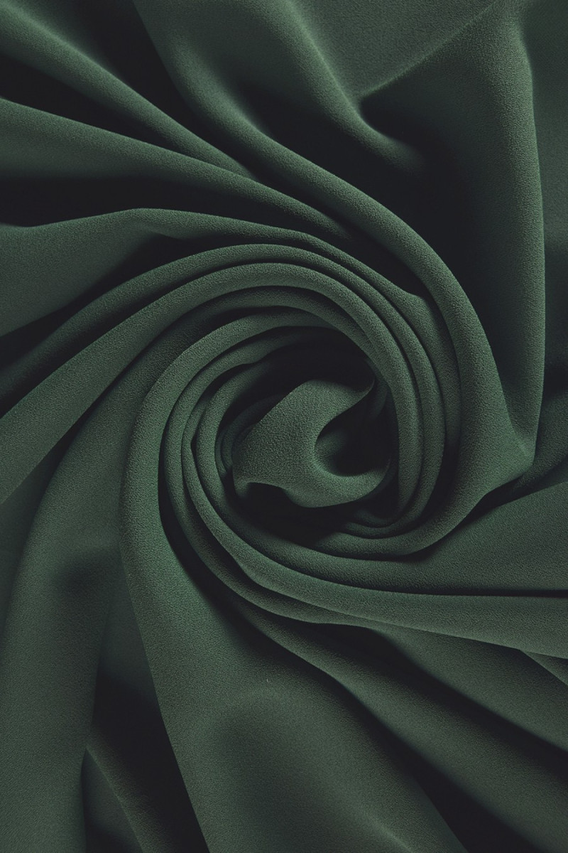 Włoska tkanina typu cadi o splocie żorżetowym w kolorze butelkowej zieleni. Tkanina jest nieelastyczna, ciężka i lejąca. Idealna do uszycia sukienki, spódnicy lub spodni.