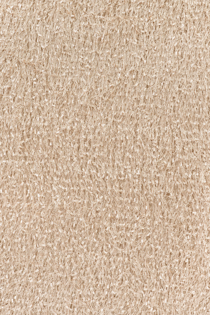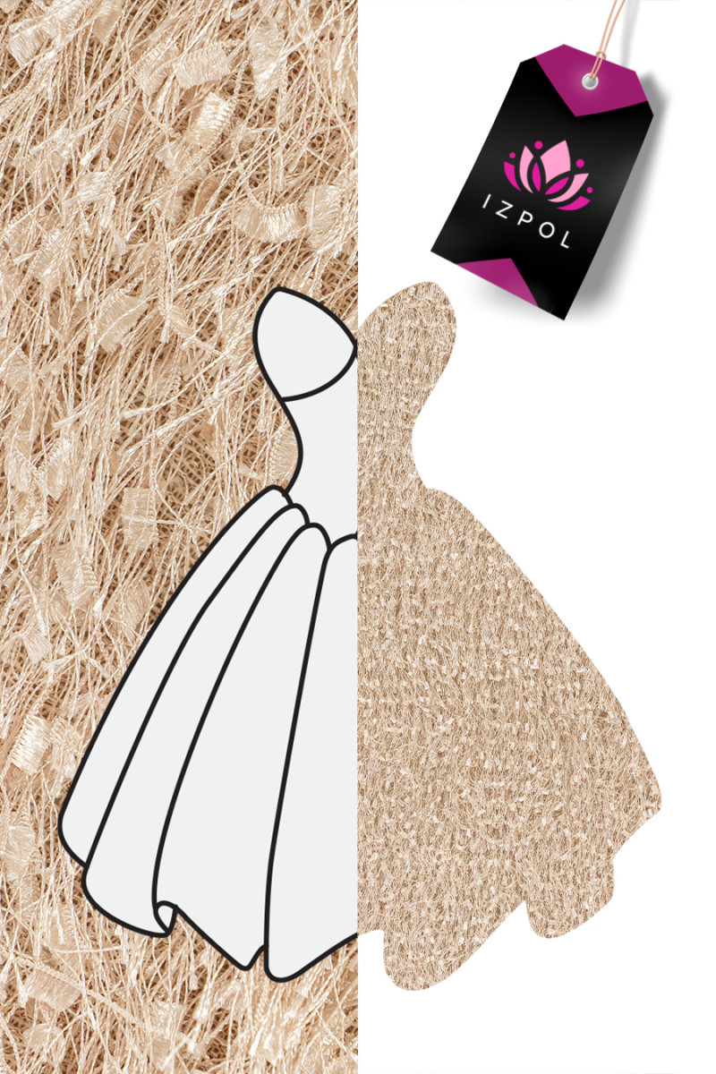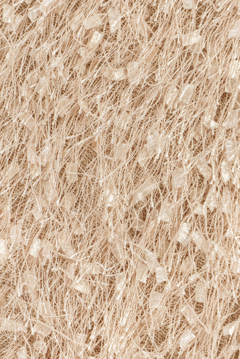 Włoska tkanina z gęstymi frędzelkami o długości 3 cm w kolorze beżowym. Tkanina miękka, elastyczna, przyjemna w dotyku - idealna do uszycia eleganckiej sukienki, bluzki, spódnicy lub do celów dekoracyjnych.
