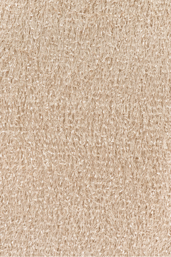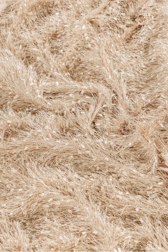 Włoska tkanina z gęstymi frędzelkami o długości 3 cm w kolorze beżowym. Tkanina miękka, elastyczna, przyjemna w dotyku.