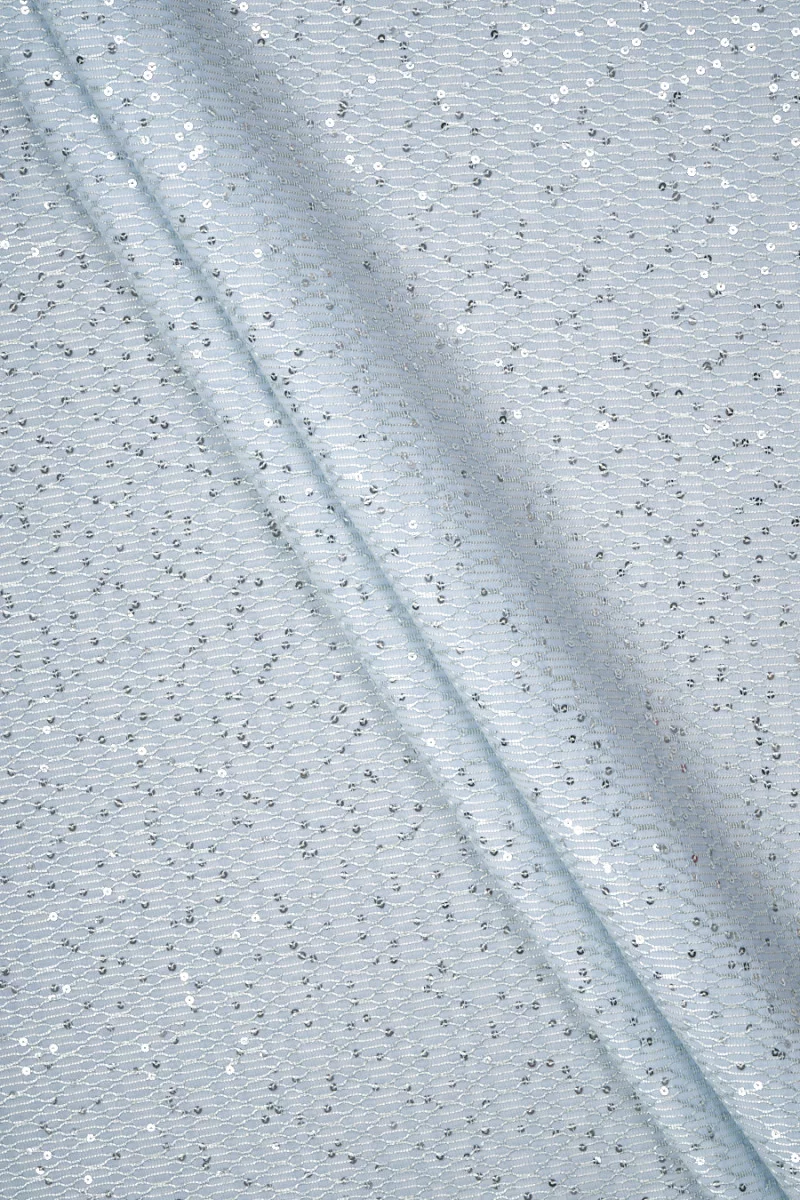 Włoska tkanina kostiumowa typu chanel w kolorze lodowego błękitu. Tkanina gładka z naszytą sznurkową siateczką oraz ozdobiona drobnymi cekinami. Tkanina średniej grubości, nieelastyczna, delikatnie sztywna. Idealna do uszycia sukni, spódnicy lub do celów dekoracyjnych.