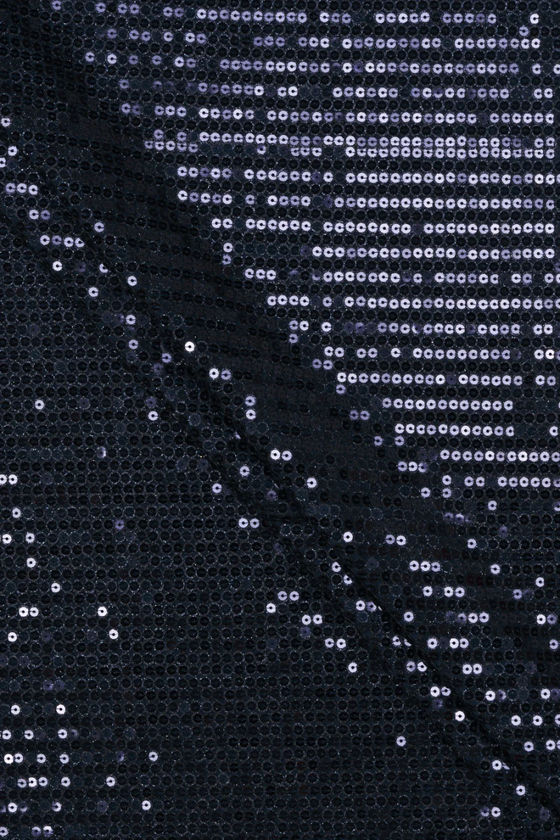 Włoska tkanina wieczorowa - cekiny w kolorze granatowym z brokatową obwódką, naszyte na poliestrowym szyfonie w kolorze granatowym. Tkanina ciężka, pięknie błyszcząca, nieelastyczna. Idealna do uszycia wieczorowej sukni, bluzki lub spódnicy.