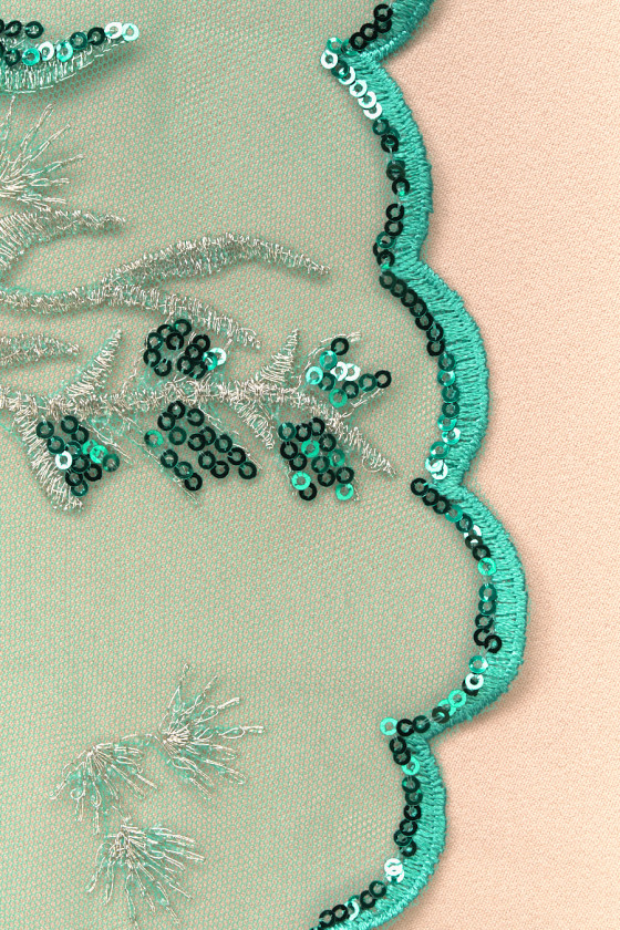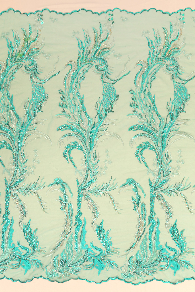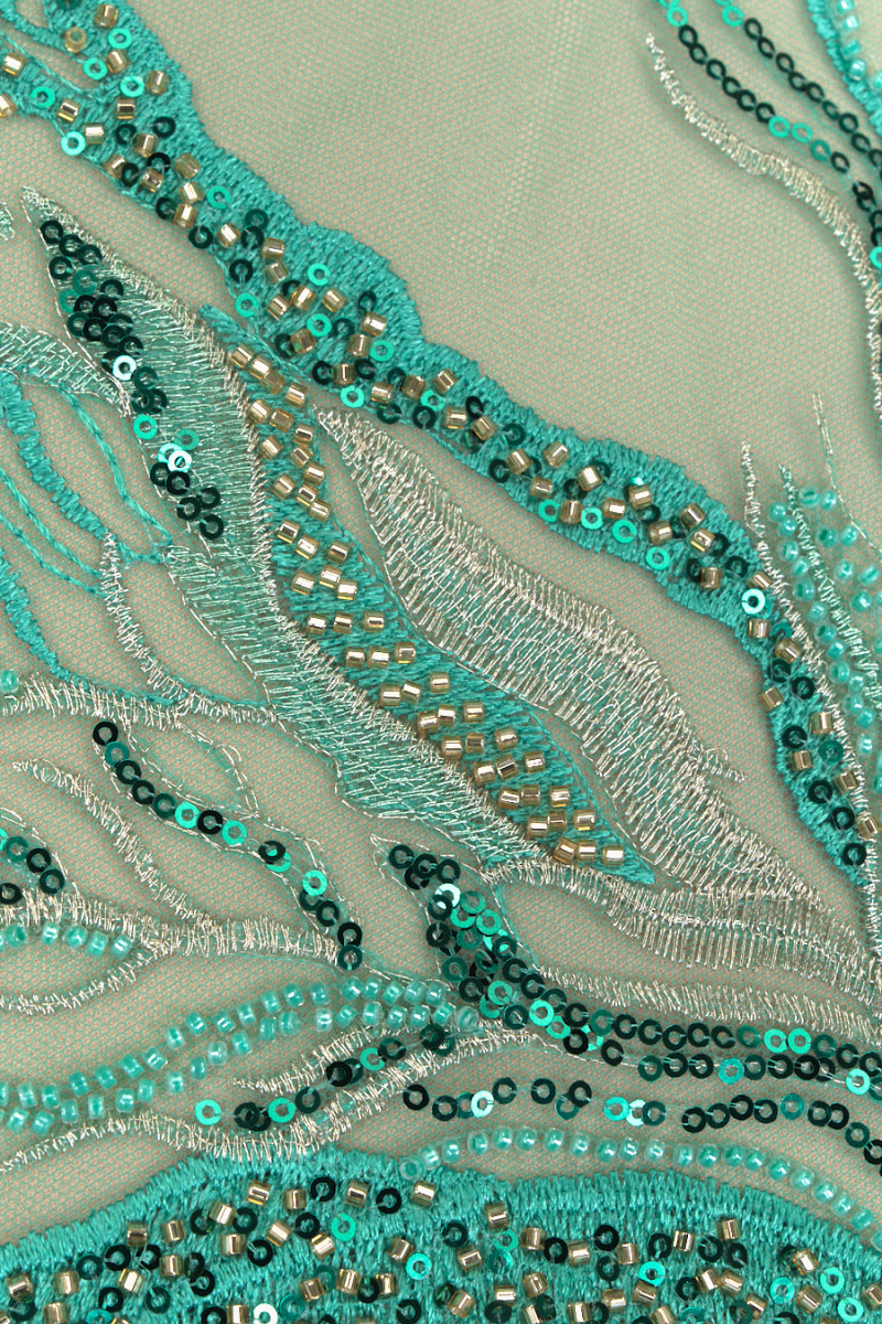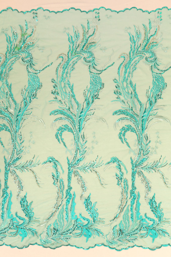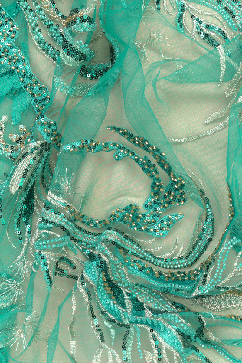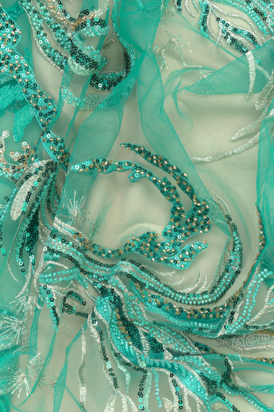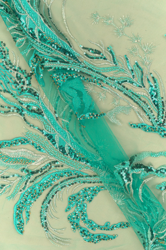 Włoska tkanina wieczorowa w kolorze turkusowym. Sztywny tiul w tym samym kolorze z haftem w kolorze turkusowym oraz srebrnym, bogato ozdobiono go turkusowymi cekinami oraz drobnymi, turkusowymi i złotymi koralikami. Układają się one w fantazyjny wzór, który zagęszcza się w kierunku jednego brzegu - tkaninę szyjemy obwodowo. Tkanina z obu stron wykończona jest ozdobnym zębem. Wspaniała propozycja w najmodniejszym od kilku sezonów kolorze. Idealnie sprawdzi się do uszycia eleganckiej sukni, spódnicy lub bluzki.