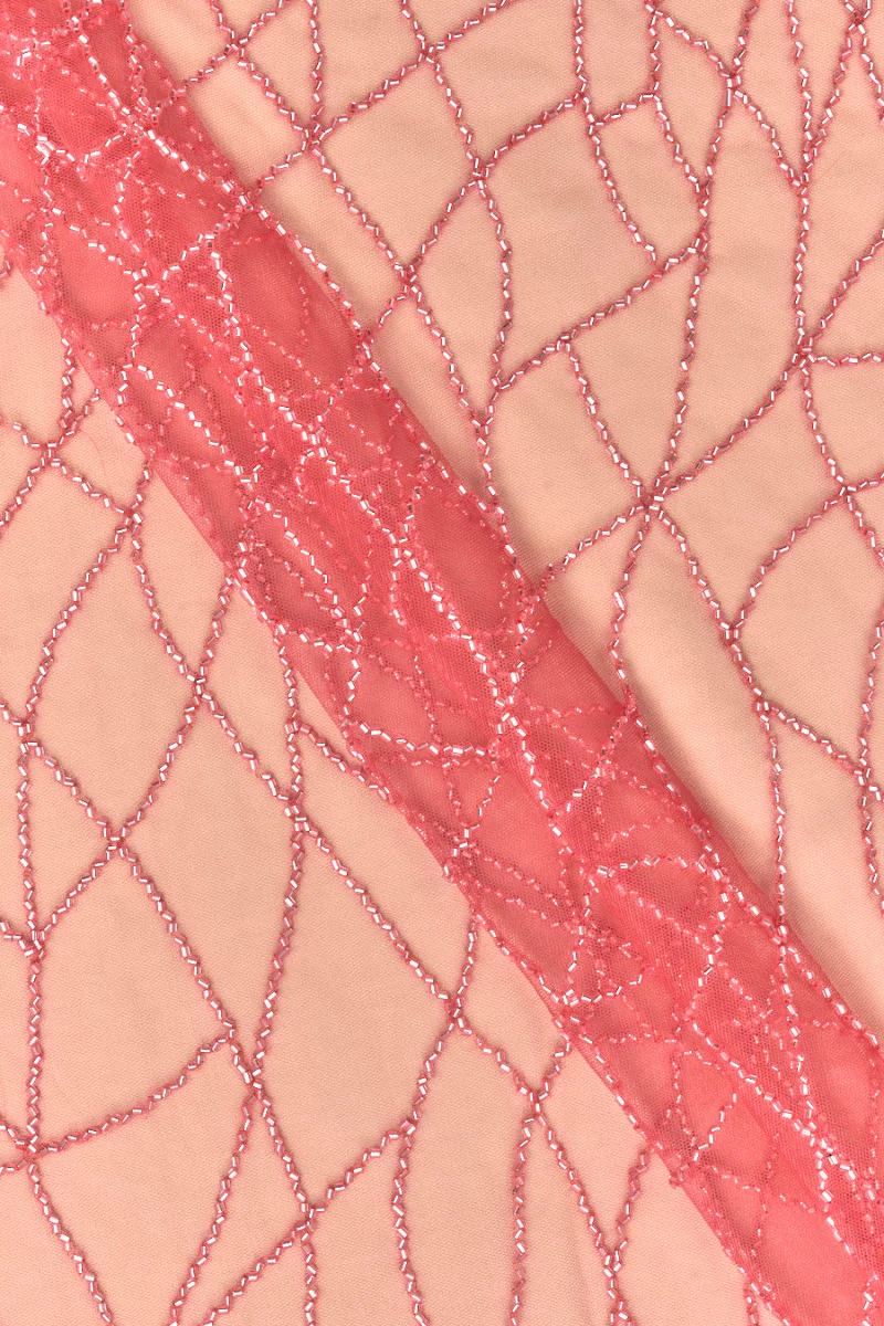 Włoski sztywny tiul o klasycznych oczkach w kolorze koralowym. Jest on subtelnie ozdobiony walcowatymi koralikami w tym samych kolorze. Tworzą one wzór geometryczny przypominający romby, który zagęszcza się w kierunku jednego brzegu tkaniny (nie ma ozdobnego wykończenia). Tkanina jest bardzo efektowna, transparentna (wymaga podszewki), ciężka, lekko elastyczna - szyjemy ją obwodowo. Fantastyczna propozycja do uszycia wieczorowej sukienki, spódnicy lub bluzki w bardzo ciekawym wydaniu.