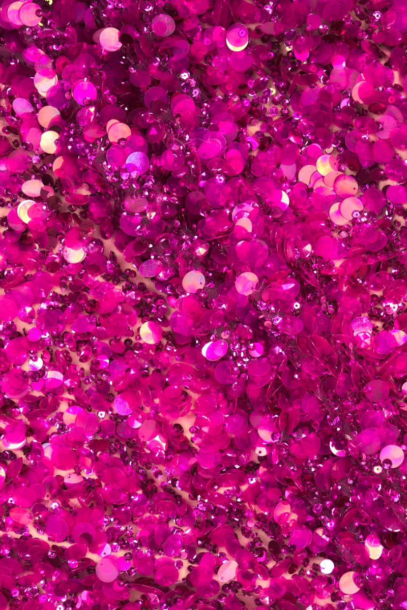 Włoski sztywny tiul o klasycznych oczkach w kolorze fuksji. Został on bardzo bogato ozdobiony dużymi, przeźroczystymi cekinami w kolorze fuksji, mają one średnicę ok 1cm oraz mniejszymi cekinami w tym samym kolorze. Tkanina jest bardzo efektowna, delikatnie transparentna (wymaga podszewki), ciężka, nieelastyczna. Fantastyczna propozycja do uszycia wieczorowej sukienki, spódnicy lub bluzki w bardzo ciekawym wydaniu.