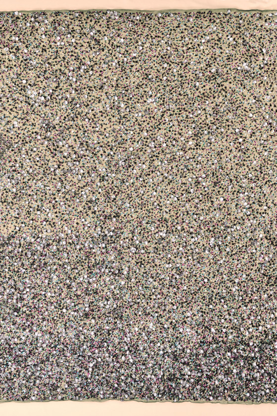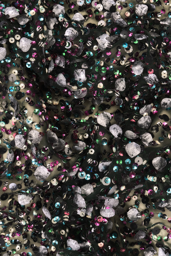 Włoski sztywny tiul o klasycznych oczkach w kolorze butelkowej zieleni. Został on bardzo bogato ozdobiony cekinami w kolorze fuksji, zieleni, turkusu, czerni oraz szarymi muszlami o średnicy około 1 cm. Cekiny i muszle zagęszczają się w kierunku jednego brzegu tkaniny - szyjemy ją obwodowo. Tkanina jest bardzo efektowna, transparentna (wymaga podszewki), ciężka, nieelastyczna. Fantastyczna propozycja do uszycia wieczorowej sukienki, spódnicy lub bluzki w bardzo ciekawym wydaniu.