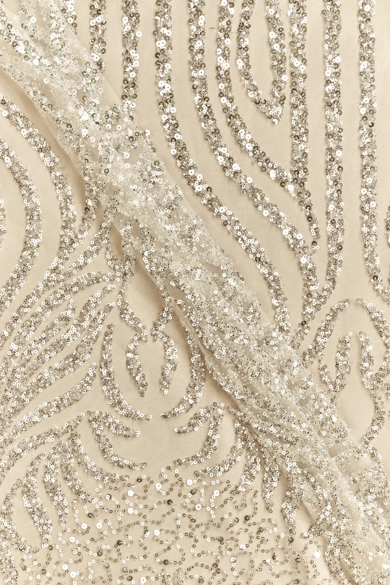 Włoski, ekskluzywny tiul o klasycznych oczkach w kolorze szampańskim bogato zdobiony srebrnymi koralikami i lekko transparentnymi cekinami. Wzór układa się w pionowe pasy o szerokości 1,5 cm, które rozchodzą się w półokręgi i zagęszczają się w kierunku jednego brzegu - tkaninę szyjemy obwodowo. Brzegi tkaniny wykończone beżową nitką tworzą delikatną fale. Idealnie sprawdzi się do uszycia wieczorowej sukni, bluzki lub spódnicy.
