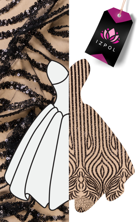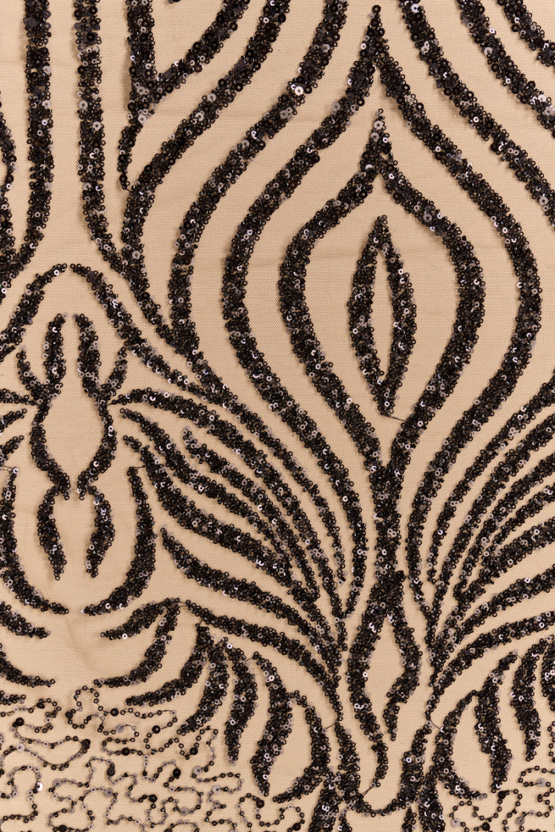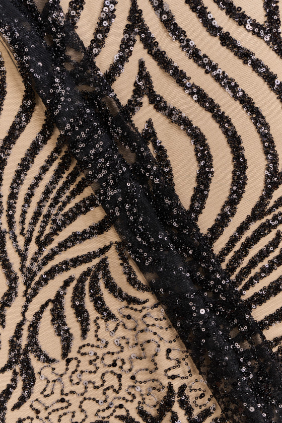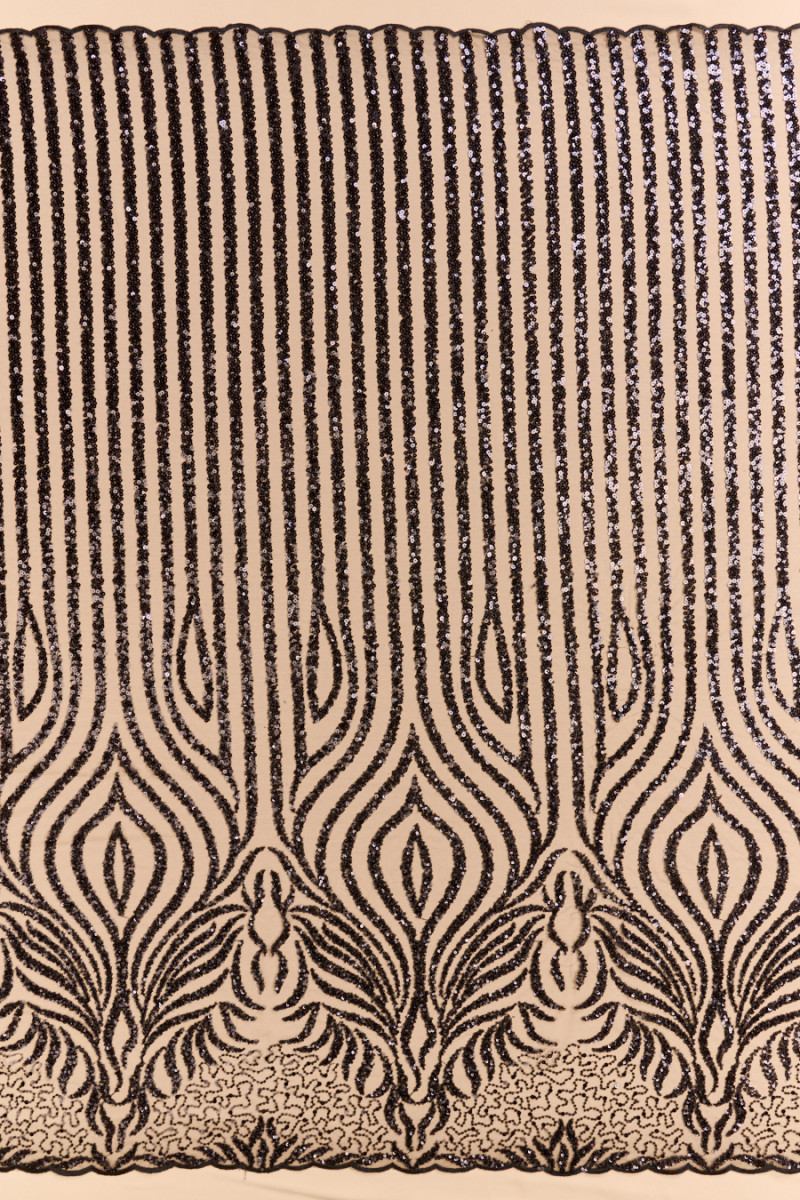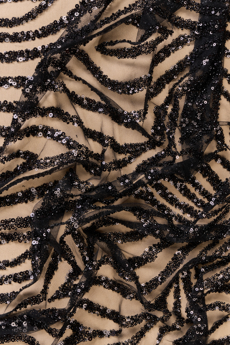 Włoski, ekskluzywny tiul o klasycznych oczkach w kolorze czarnym bogato zdobiony czarnymi koralikami i cekinami. Wzór układa się w pionowe pasy o szerokości 1,5 cm, które rozchodzą się w półokręgi i zagęszczają się w kierunku jednego brzegu - tkaninę szyjemy obwodowo. Brzegi tkaniny wykończone czarną nitką tworzą delikatną fale. Idealnie sprawdzi się do uszycia wieczorowej sukni, bluzki lub spódnicy.