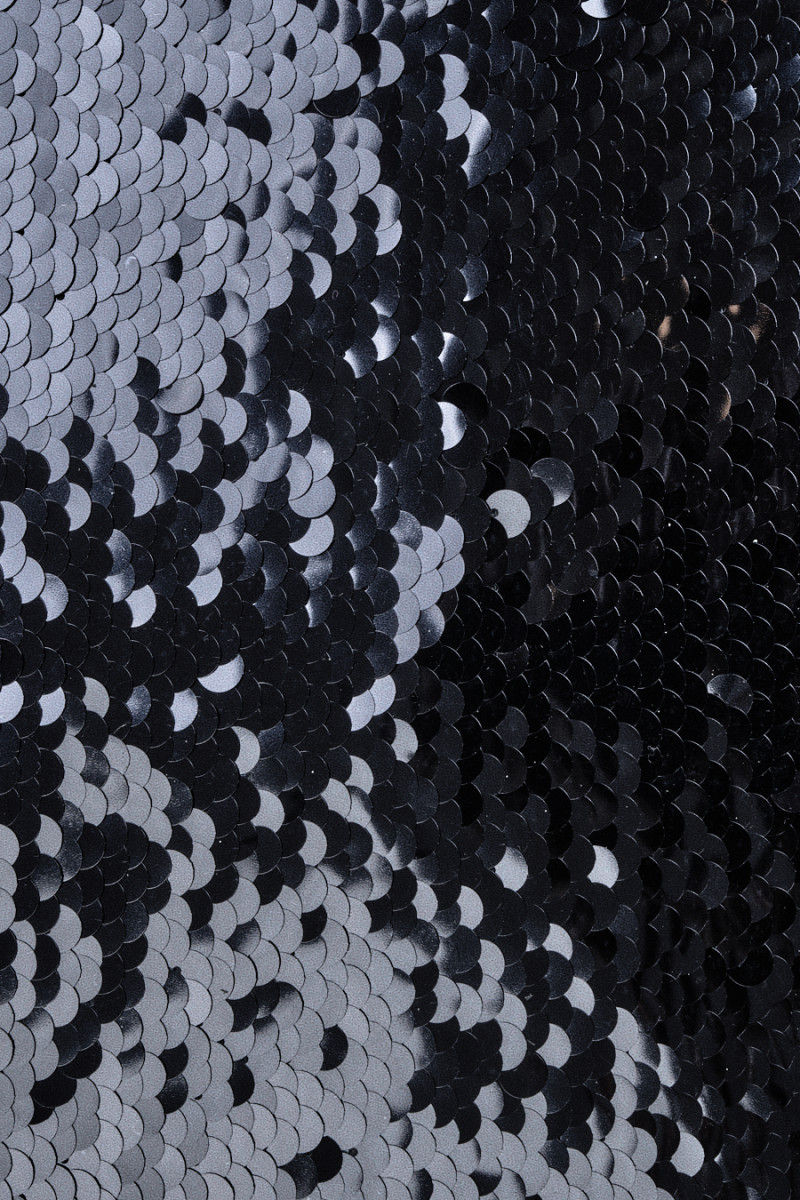 Ekskluzywna tkanina cekinowa w ciemnym granatowym kolorze. Gęsto i regularnie położone w formie rybiej łuski cekiny o wielkości 8 mm, które pięknie odbijają światło, tworząc niesamowity błyszczący efekt. Cekiny przyszyte na granatowej elastycznej siatce o szerokości 155 cm, cekiny położone na szerokości 130 cm. Fantastyczna propozycja do uszycia wieczorowej sukienki, spódnicy lub bluzki w olśniewającym wydaniu.