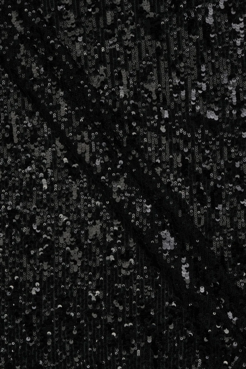 Ekskluzywna tkanina cekinowa w kolorze czarnym, granatowym i złotym. Dwa rozmiary cekin położone w regularnych rzędach - zlecamy szycie obwodowe. Cekiny przyszyte na elastycznej siatce o szerokości 160 cm, cekiny położone na szerokości 130 cm. Cekiny złote umieszczone na siatce w białym kolorze, pozostałe w kolorze cekin. Tkanina jest elastyczna, lekko transparentna, miękka i lekka. Super propozycja do uszycia wieczorowej sukienki, spódnicy bluzki.