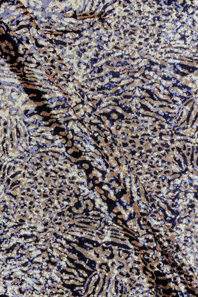 Elegancka czarna siatka z gęsto przyszytymi cekinami w kolorze lekko różowego złota oraz ciemnego granatu. Położenie błyszczących elementów przypomniana umaszczenie egzotycznego kota. Materiał jest raczej cienki i spływający (dość ciężko spada). Jest elastyczny oraz delikatnie transparentny. Interesująca propozycja, która doskonale sprawdzi się na wieczorowe kreacje, takie jak sukienki, spódniczki, bluzki a także do wykorzystania jako elementy ozdobne.
