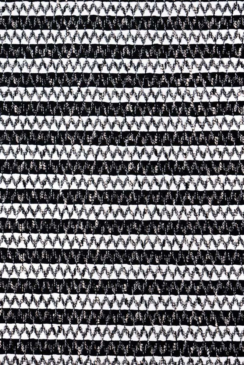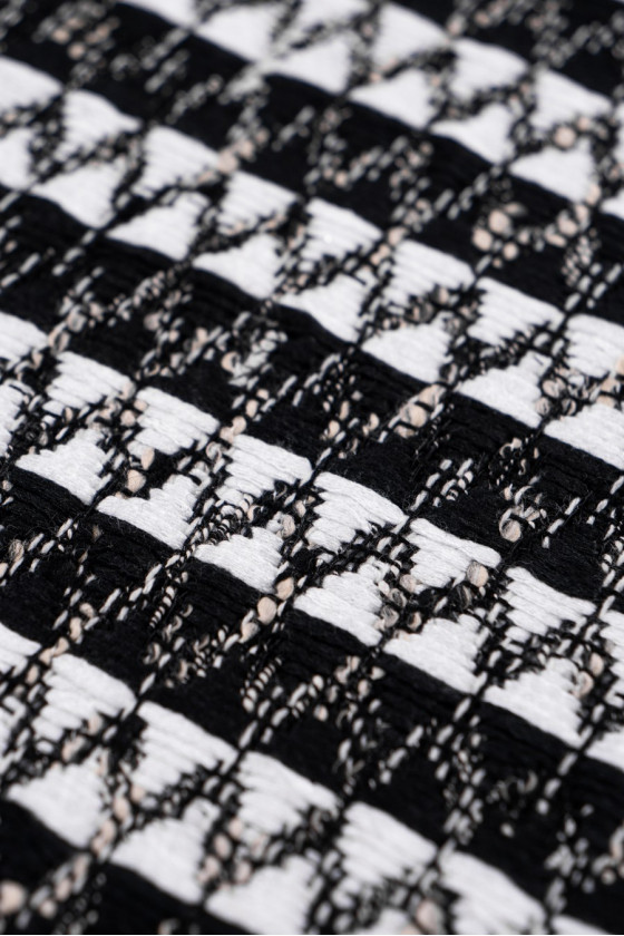 Tkanina typu chanel znanego projektanta mody utkana w ciekawy biało-czarny wzór zygzaka. Polecamy do uszycia cienkich płaszczyków, marynarek, kostiumów.