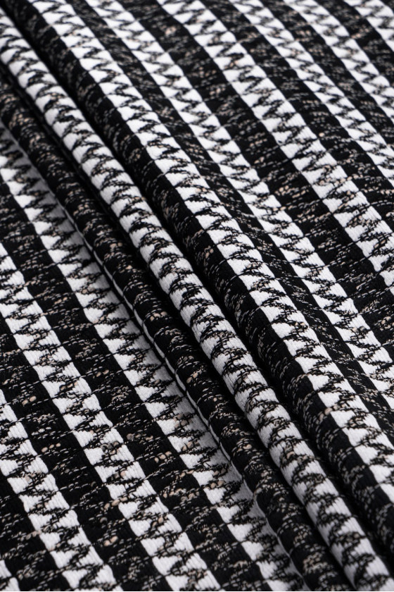 Tkanina typu chanel znanego projektanta mody utkana w ciekawy biało-czarny wzór zygzaka. Materiał bardzo przyjemny i miękki w dotyku. Polecamy do uszycia cienkich płaszczyków, marynarek, kostiumów.