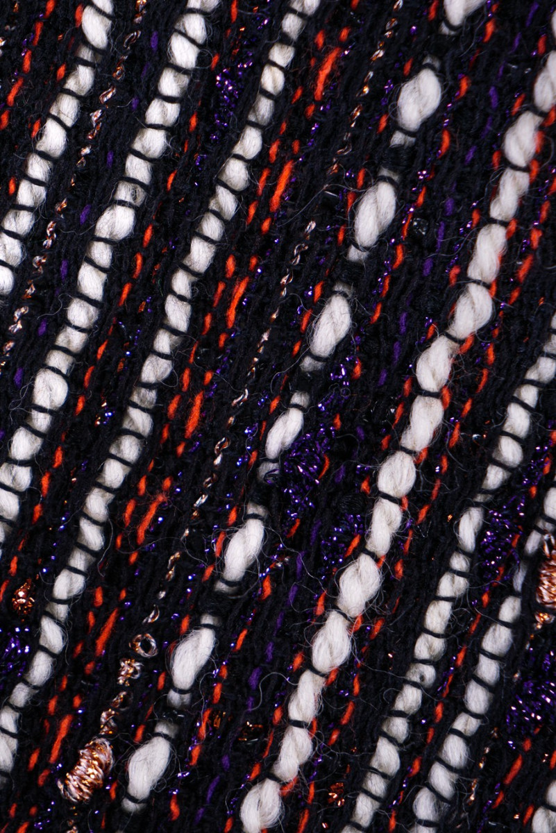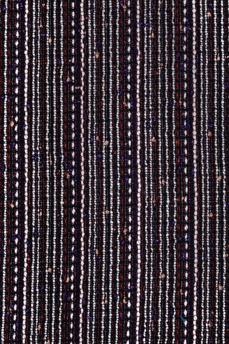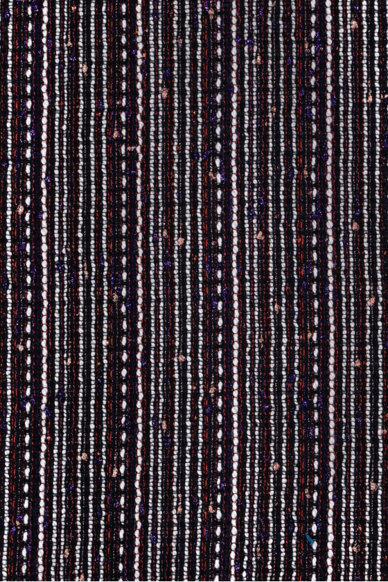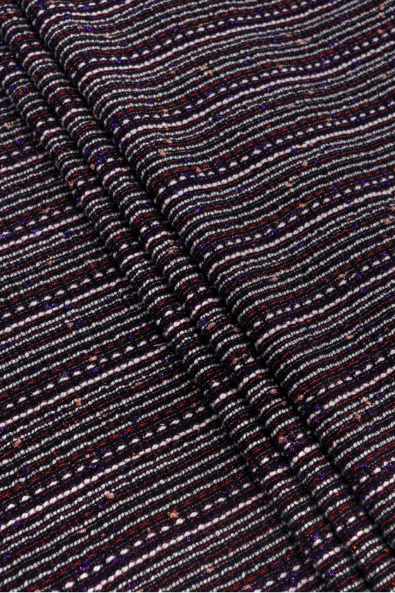 Włoska tkanina kostiumowa typu chanel z nitką lureksową, zwarty splot w formie pasków. Kolorystyka: czarny, fiolet, ecru, rudy, złoty.