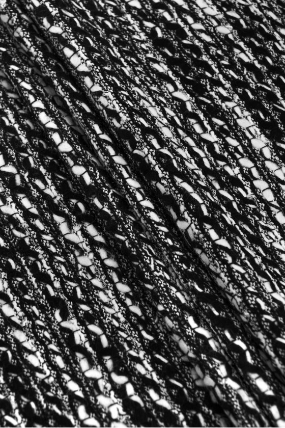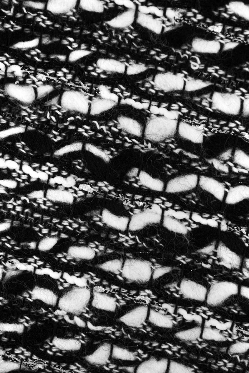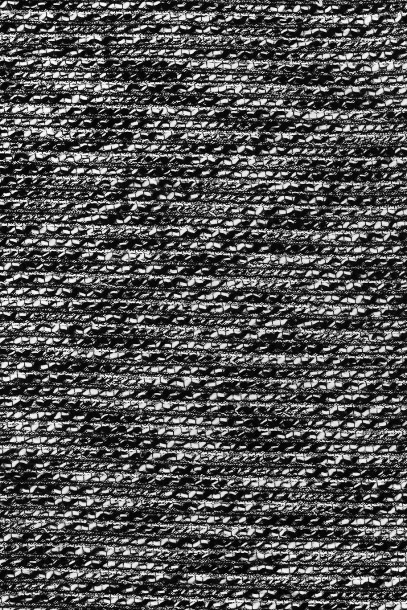 Włoska tkanina kostiumowa typu chanel w kolorze czarno białym z wplecioną srebrną, błyszczącą nitką. Białe i czarne nitki przeplatają się ze sobą, tworząc delikatny wzór pasków. Tkanina jest miękka, lekka, nieelastyczna oraz ma luźny splot, wymaga podszewki. Ponadczasowa propozycja, która doskonale sprawdzi się w uszyciu kostiumu, żakietu czy sukienki.