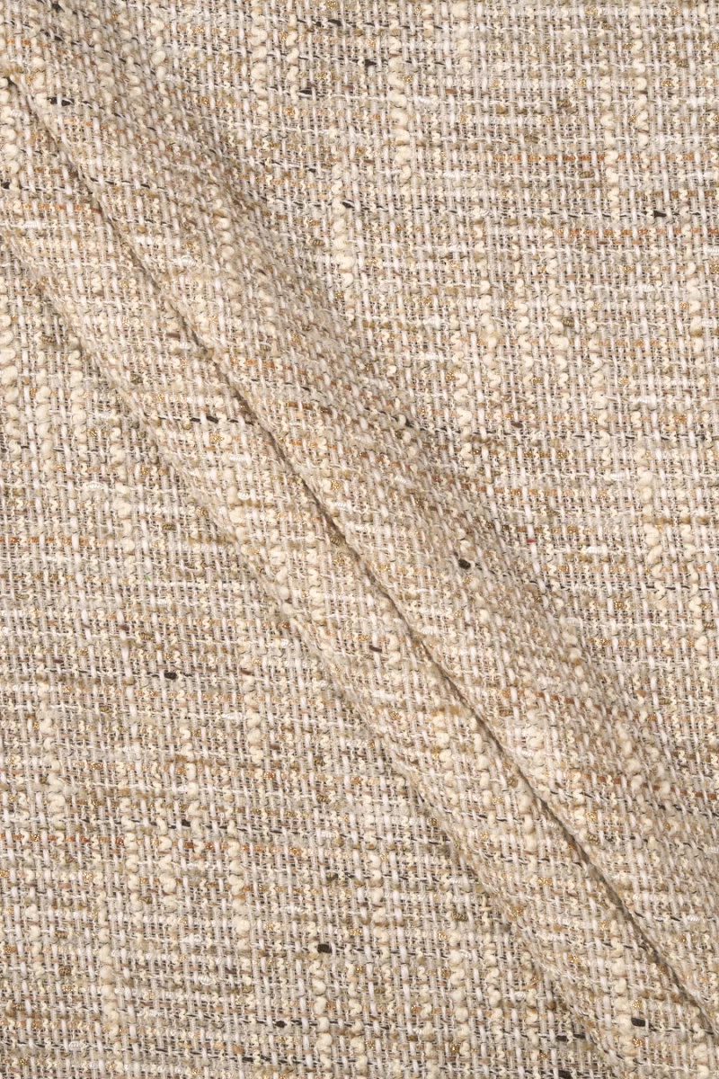 Włoska tkanina kostiumowa typu chanel w różnych odcieniach beżu ze złotą nitką. Tkanina typu chanel to tkanina bardzo elegancka, miękka i mięsista, znana z oryginalnego splotu. Idealna do uszycia kostiumu, marynarki, żakietu, spódnicy lub cienkiego płaszcza.