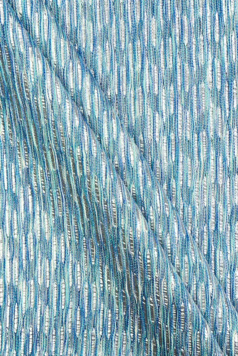 Włoska tkanina kostiumowa typu chanel wykonana w bardzo ciekawym splocie, gdzie nitki w odcieniach niebieskiego i śmietanowego tworzą delikatne fale, a przestrzenie między nimi wypełnione są srebrną, błyszczącą nitką. Tkanina jest nieelastyczna, średniej grubości i układa się lekko sztywno. Dzięki dużej zawartości bawełny, materiał jest przyjemny w chwycie, co przekłada się także na komfort noszenia. Świetna propozycja dla osób szukających ciekawego wzornictwa w tkaninach. Można z niej uszyć kostiumy, żakiety, spódnice lub sukienki.