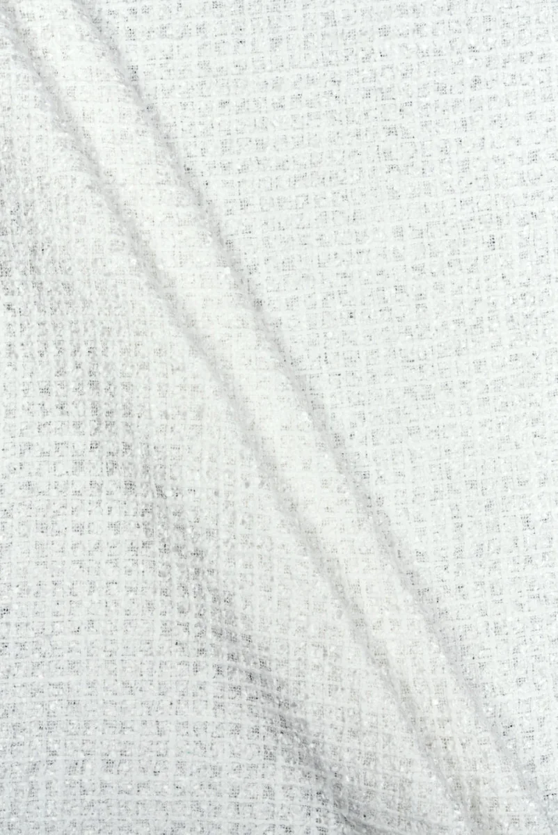 Włoska tkanina kostiumowa typu chanel w kolorze białym. Całość utkana w delikatny i drobny wzór kratki. Tkanina jest bardzo elegancka, miękka, nieelastyczna, lekko transparentna, o luźnym, charakterystycznym splocie. Idealna do uszycia kostiumu, marynarki, żakietu, spódnicy lub sukienki.