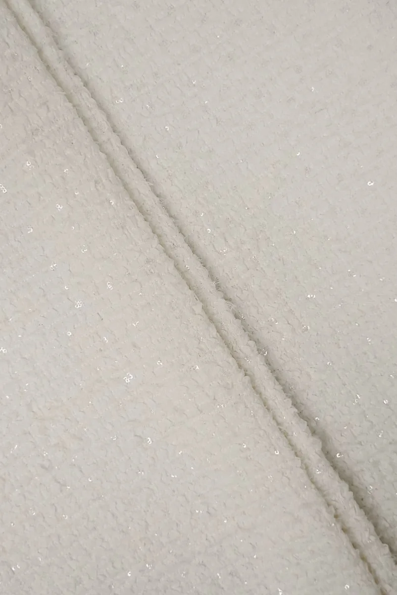Włoska tkanina typu chanel w subtelnym, śmietanowym kolorze, która wyróżnia się wyjątkową, bogatą strukturą. Materiał zdobią drobne, przeźroczyste cekinki ułożone w delikatne motywy kwiatowe, dzięki czemu całość subtelnie połyskuje i przyciąga wzrok. W strukturę tkaniny została wpleciona tasiemka, która nadaje jej charakterystycznej, przestrzennej faktury. Całość uzupełniają delikatnie odstające niteczki, podkreślające szlachetny i lekko surowy charakter materiału typowy dla klasycznych tkanin chanel. Tkanina prezentuje się niezwykle stylowo i elegancko, a jednocześnie zachowuje modny, dekoracyjny wygląd. Doskonale sprawdzi się do szycia żakietów, kostiumów, sukienek, spódnic oraz innych elementów garderoby o bardziej wyrafinowanym charakterze.