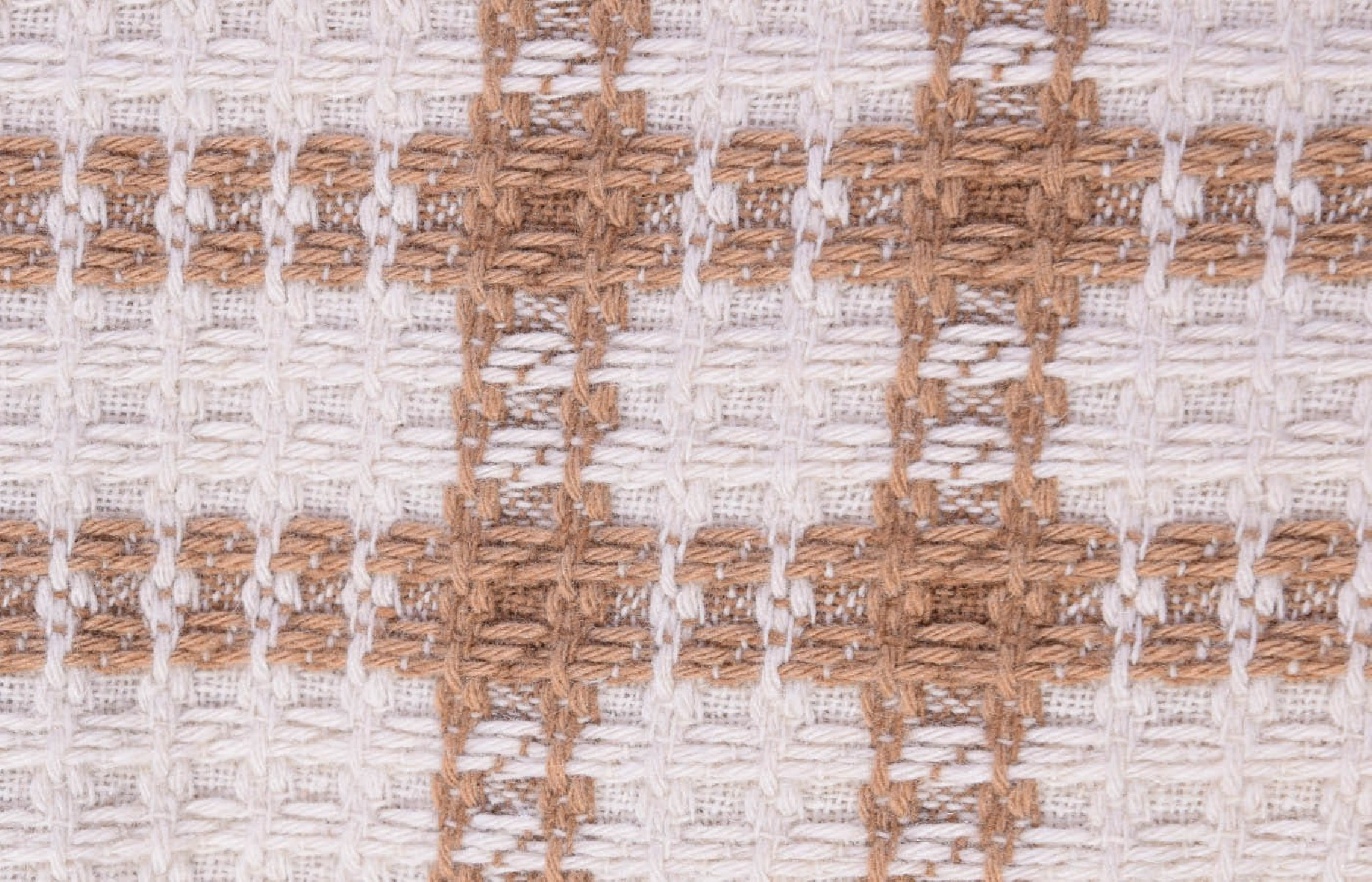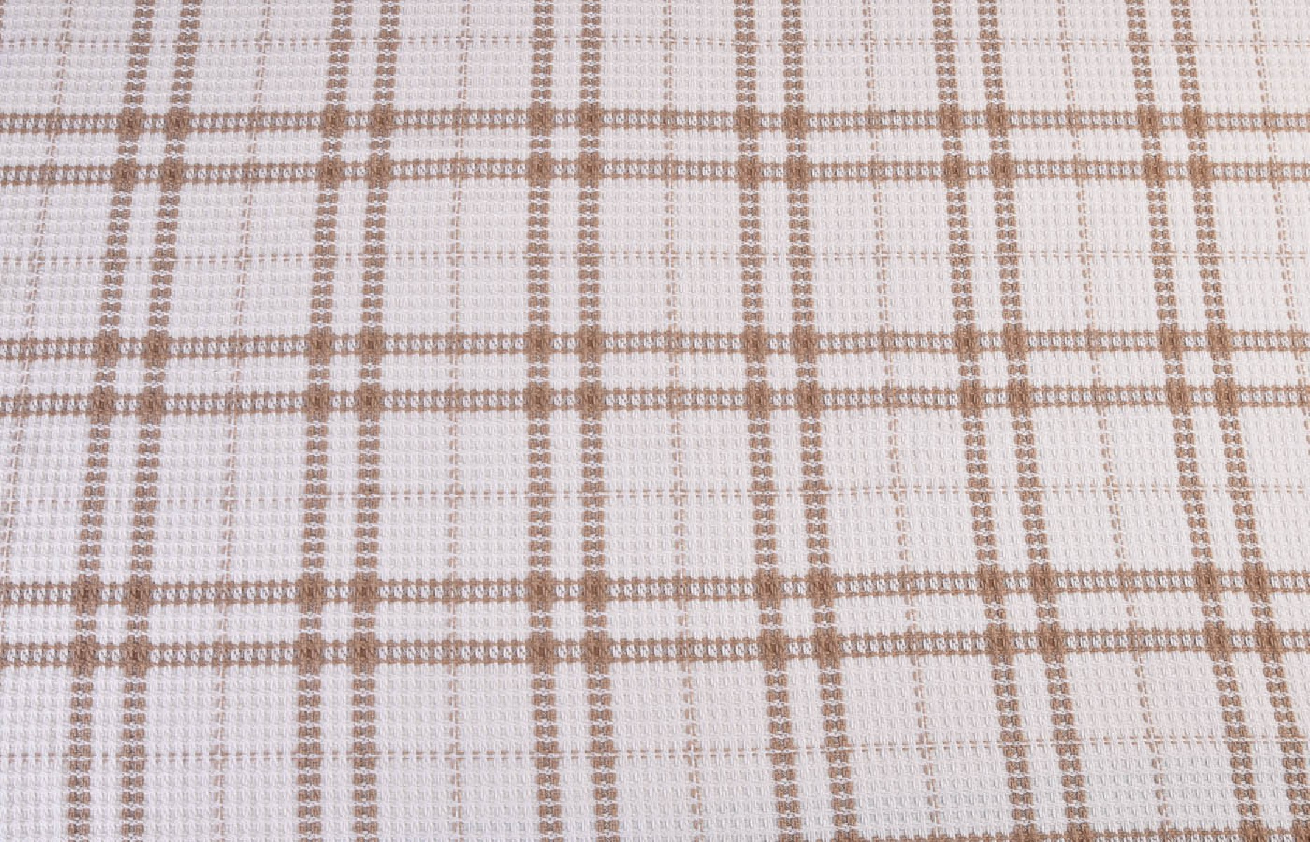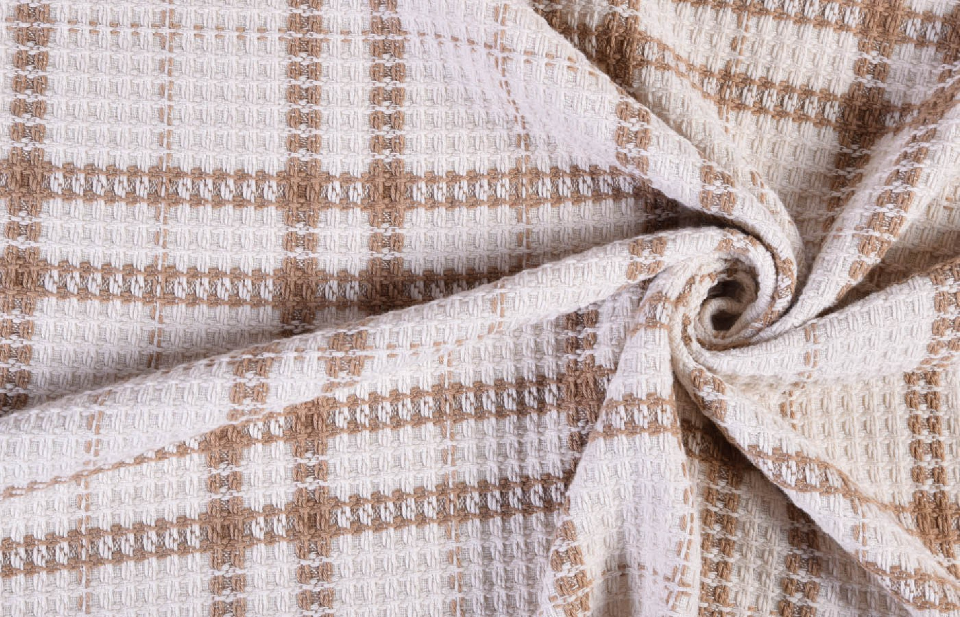 Włoska tkanina kostiumowa typu chanel w kolorze écru z motywem dużej, beżowej kraty o szerokości 25 cm. Tkanina ma bardzo ciekawe przeszycia, które sprawiają, że jej faktura staje się bardziej wypukła i przypomina strukturą "gofra". Tkanina jest wykonana z wiskozy i poliestru. Idealna propozycja do uszycia kostiumu lub cienkiego płaszcza dla fanek tweedowych ubrań.