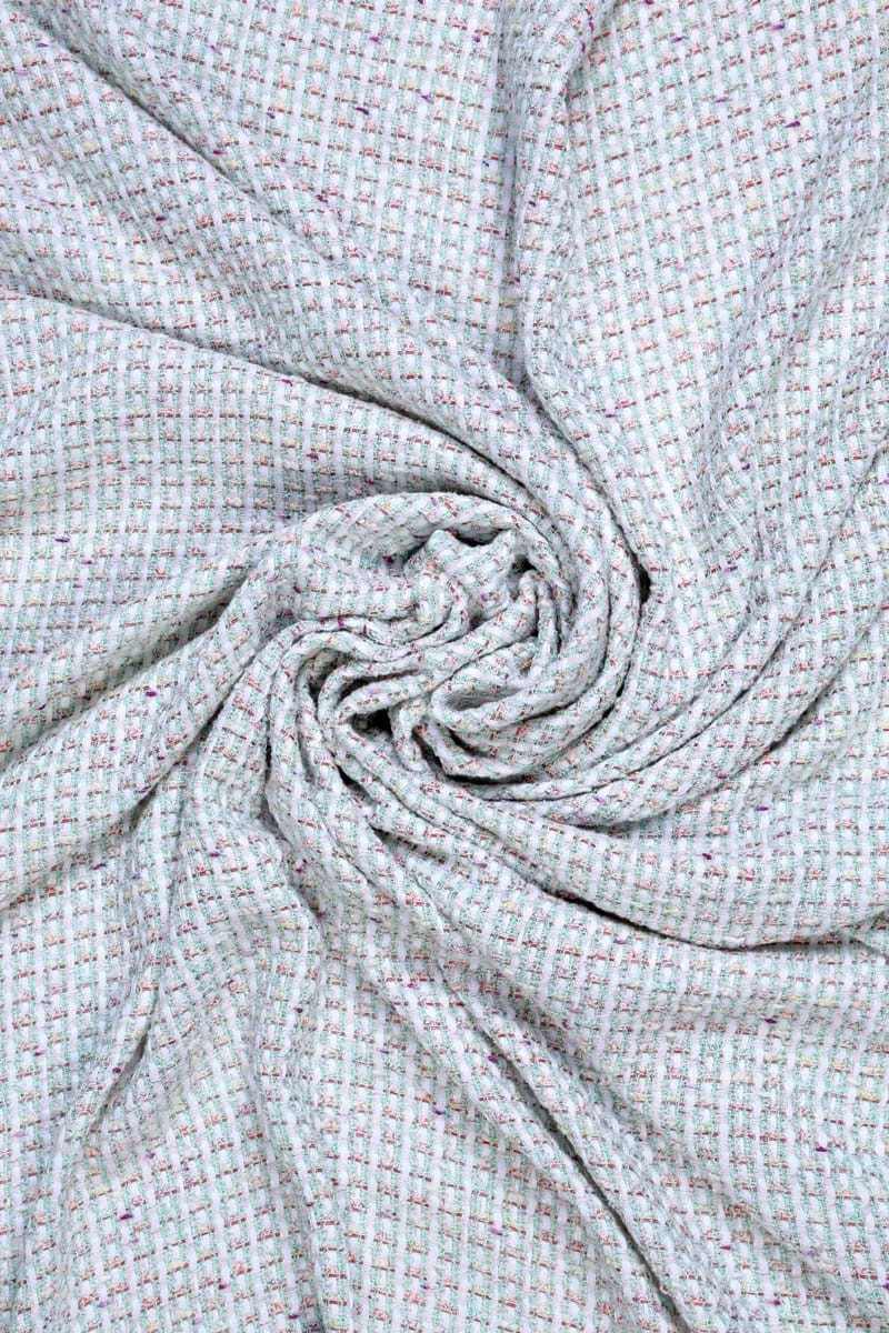 Tkanina kostiumowa chanel w pastelowych kolorach turkusu, czerwieni i bieli z przeznaczeniem na kostiumy, spódnice lub sukienki. Tkanina jest stabilna, wymaga podszycia podszewką.