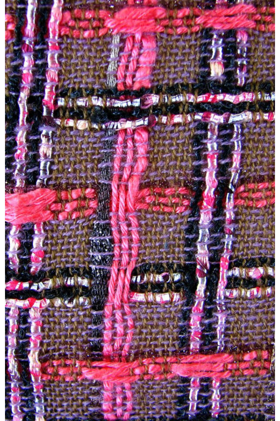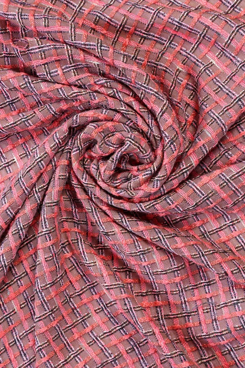 Tkanina kostiumowa chanel utkana z nitek o barwach: koralu, brudnego różu, bieli i czerni z przeznaczeniem na kostiumy, spódnice lub sukienki. Naturalne nitki takie jak wełna i wiskoza zapewniają komfort noszenia. Tkanina jest stabilna, wymaga podszycia podszewką.