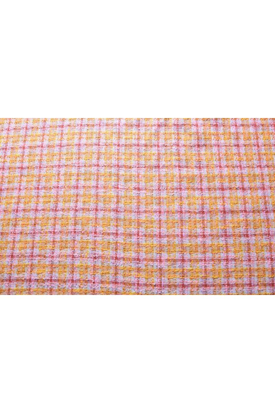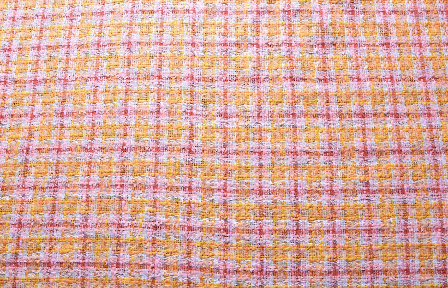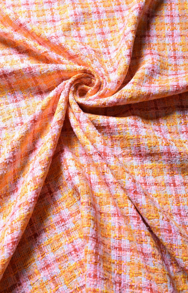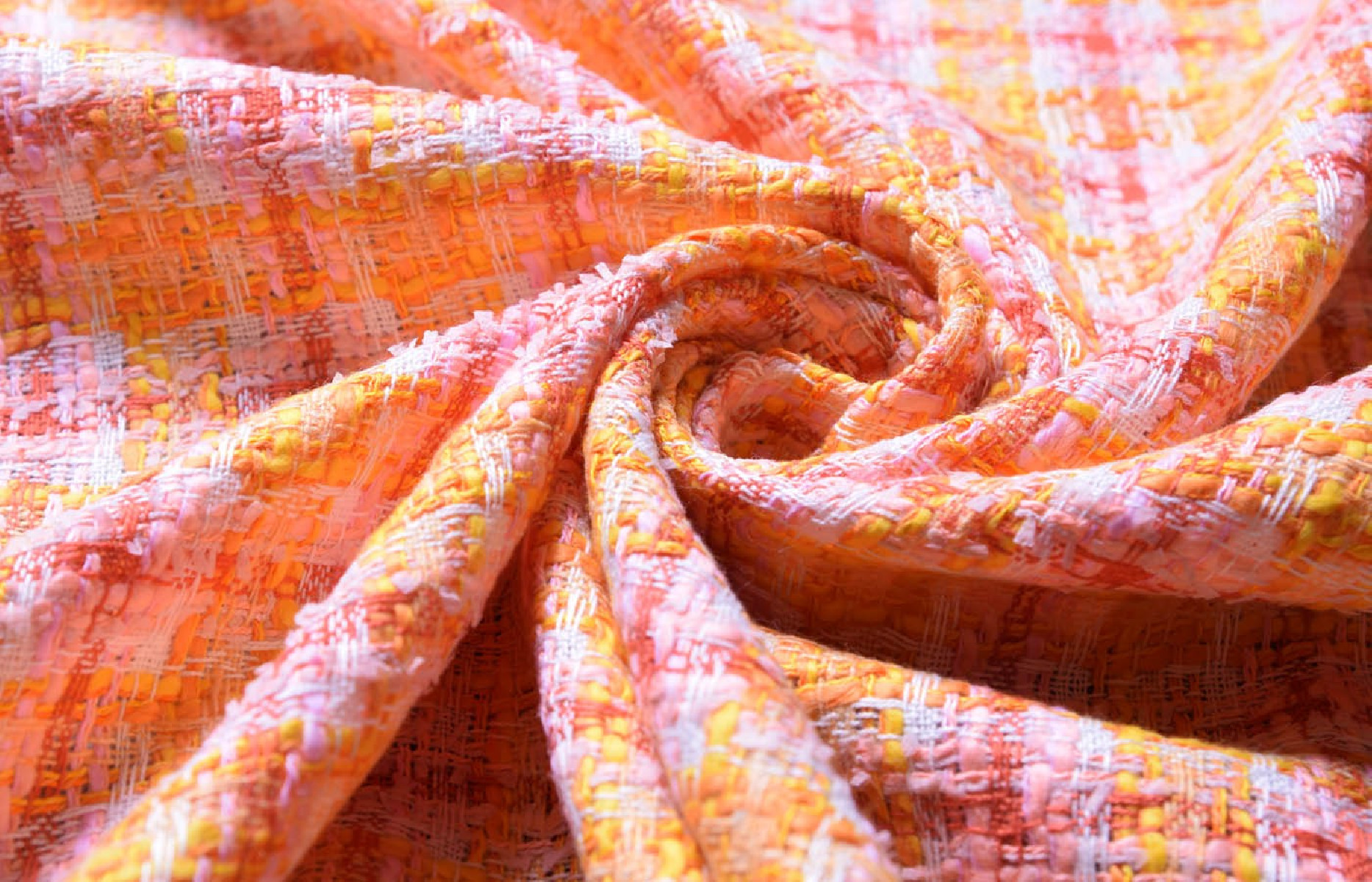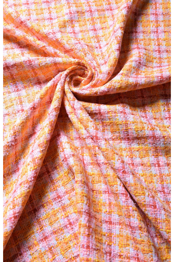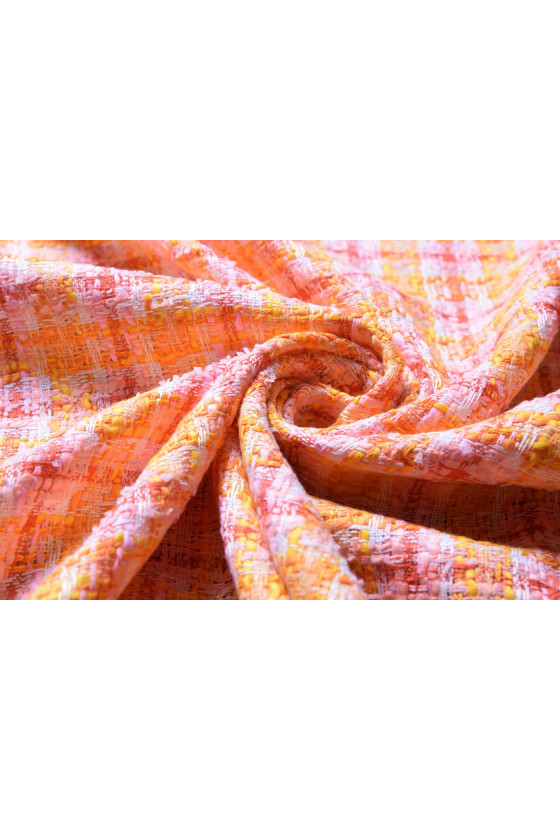 Piękna klasyczna tkanina kostiumowa typu chanel w wiosenno-letnich ciepłych barwach pomarańczu, różu i bieli. Idealna na komplety typu: żakiet + spódnica. Można z niej uszyć również wiosenno-letnią sukienkę.