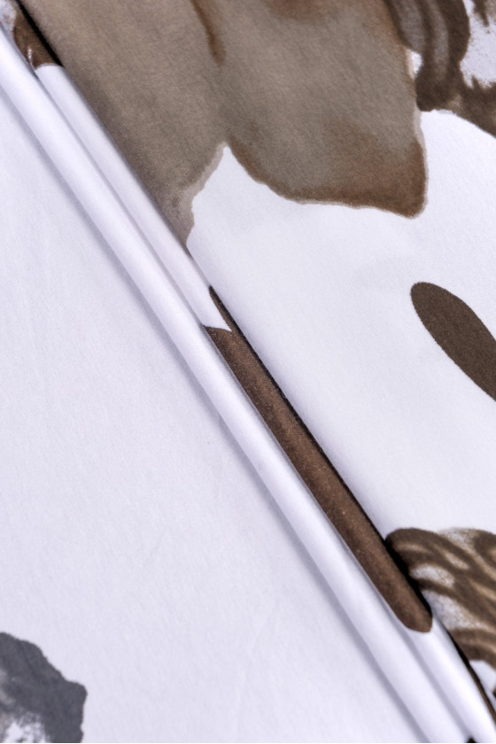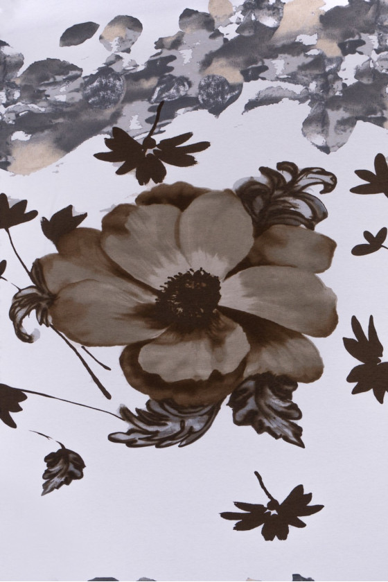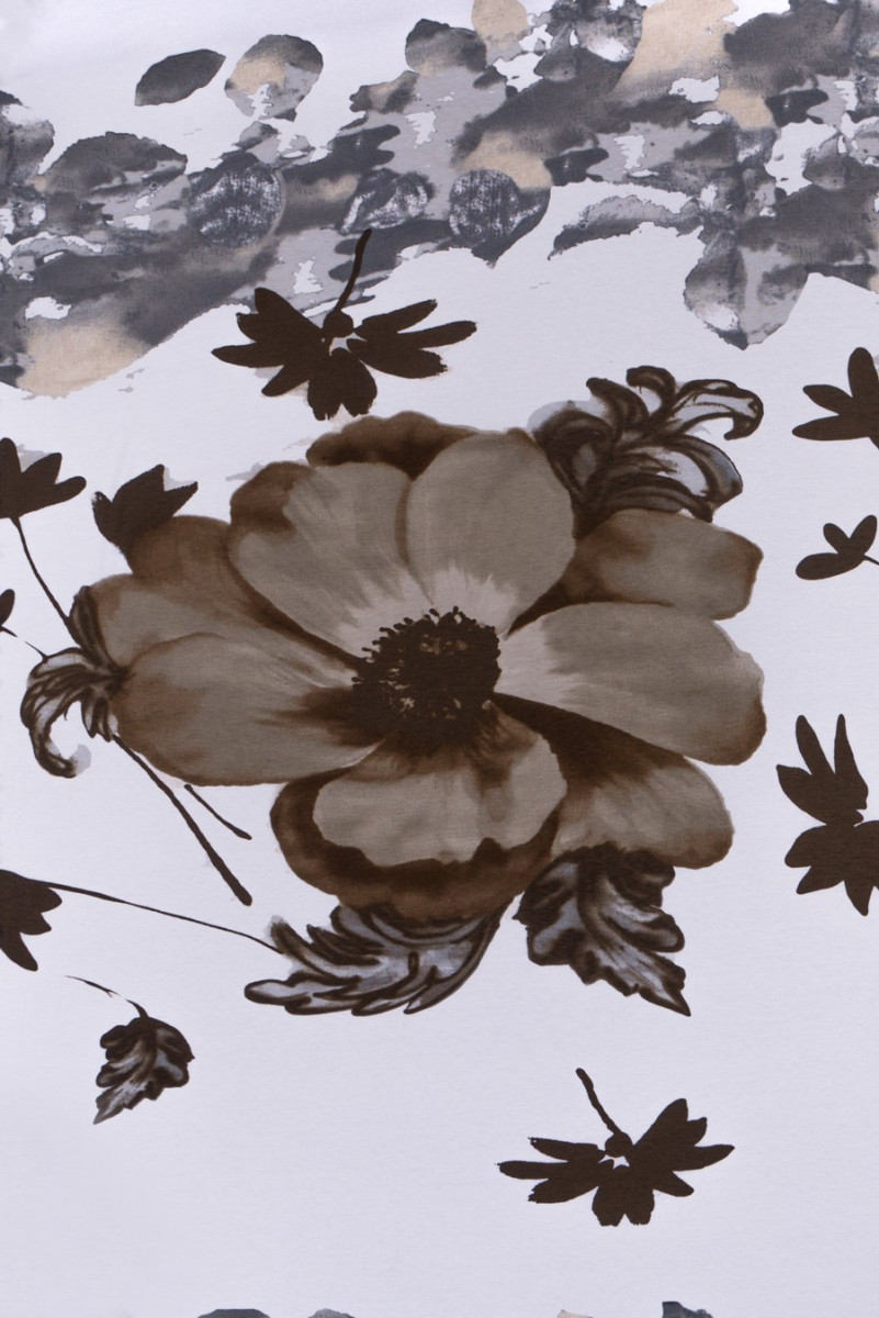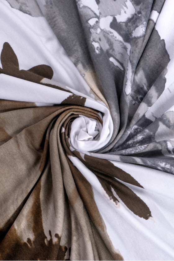 Piękna dzianina wiskozowa elastyczna o wzorze kwiatowym. Na tle ecru nadrukowano duże (50cm) brązowe kwiaty, na dole kuponu szaro-beżowy ozdobny wzór. Tkanina występuje w kuponie o wymiarach 105*160 cm.