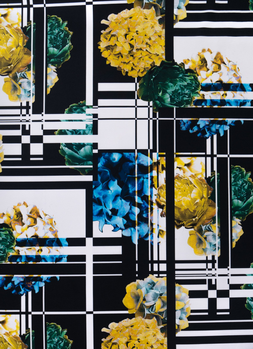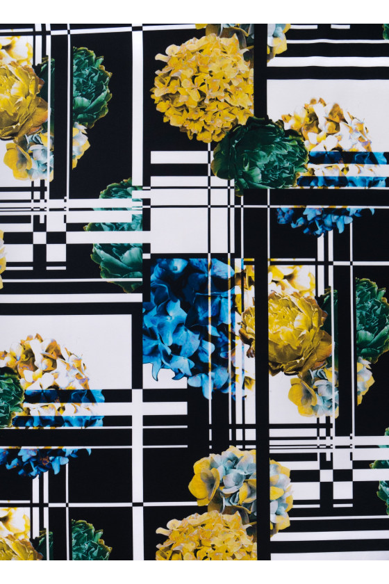 Włoska dzianina typu jersey z motywem patchworku z kolorowymi, dużymi kwiatami oraz biało-czarną kratą. Jersey to dzianina kryjąca, miękko układająca się, którą można uszyć bez podszewki.