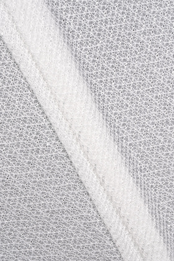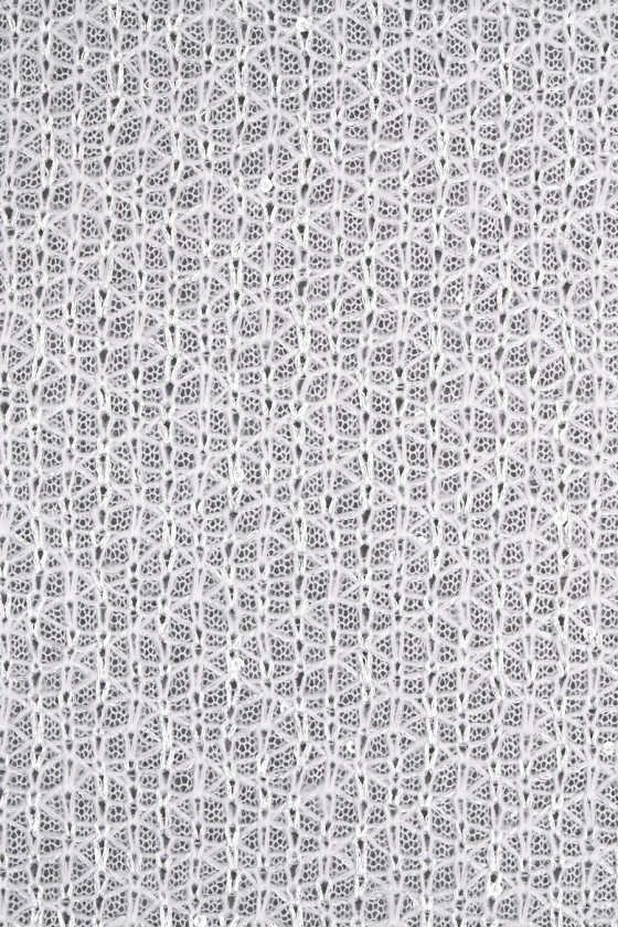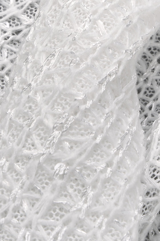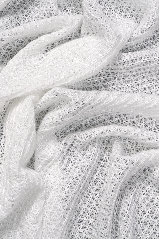 Włoska dzianina swetrowa o ażurowym splocie w kolorze śmietanowym, subtelnie ozdobiona małymi cekinami. Dzianina cienka, transparentna, delikatnie błyszcząca - idealna do uszycia sweterka lub szala.