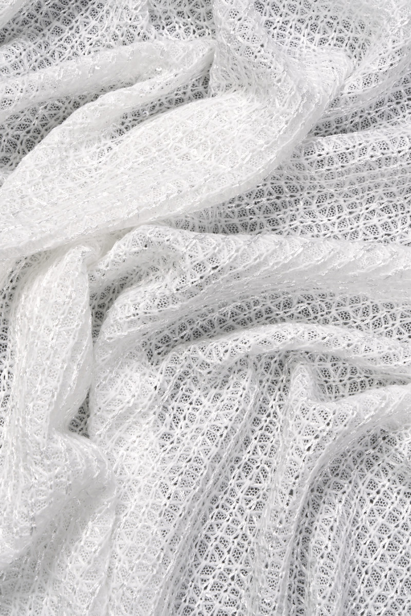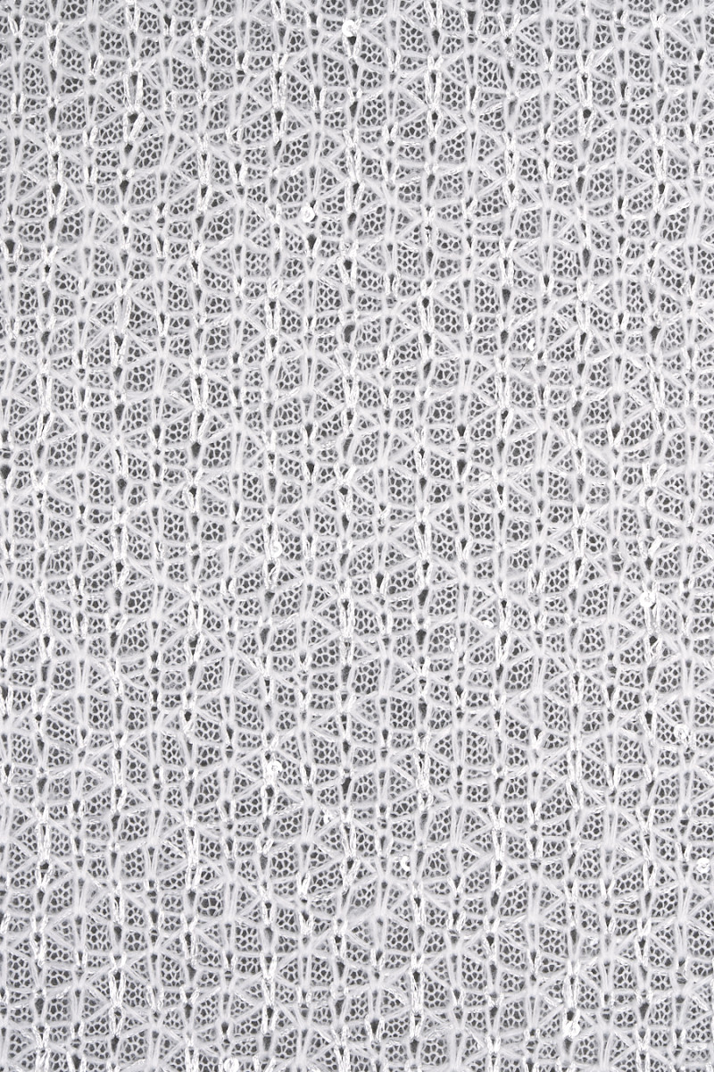Włoska dzianina swetrowa o ażurowym splocie w kolorze śmietanowym, subtelnie ozdobiona małymi cekinami.