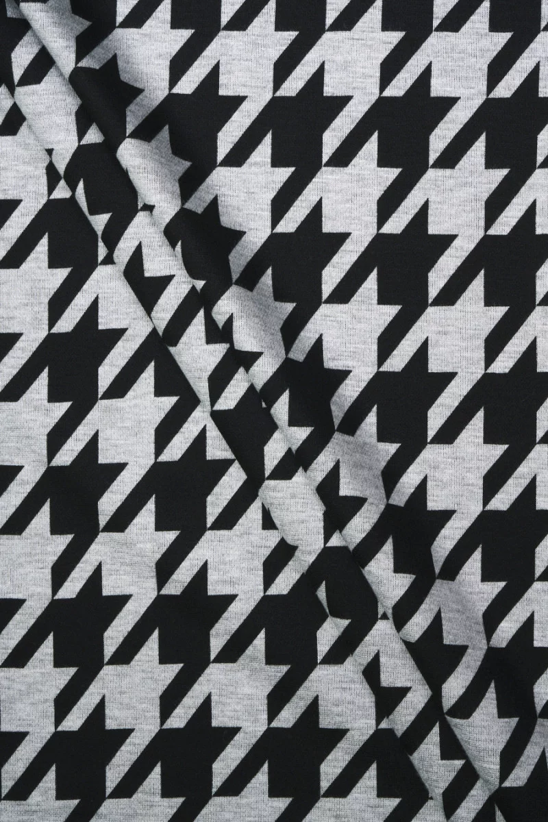 Włoska dzianina typu jersey z motywem dużej kurzej stopki (7 cm) w kolorze szarym oraz czarnym. Dzianina typu jersey to tkanina kryjąca o zwartym splocie, elastyczna, miękko układająca się, którą można uszyć bez podszewki.