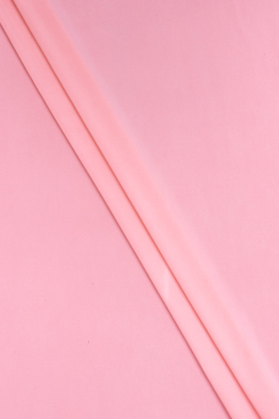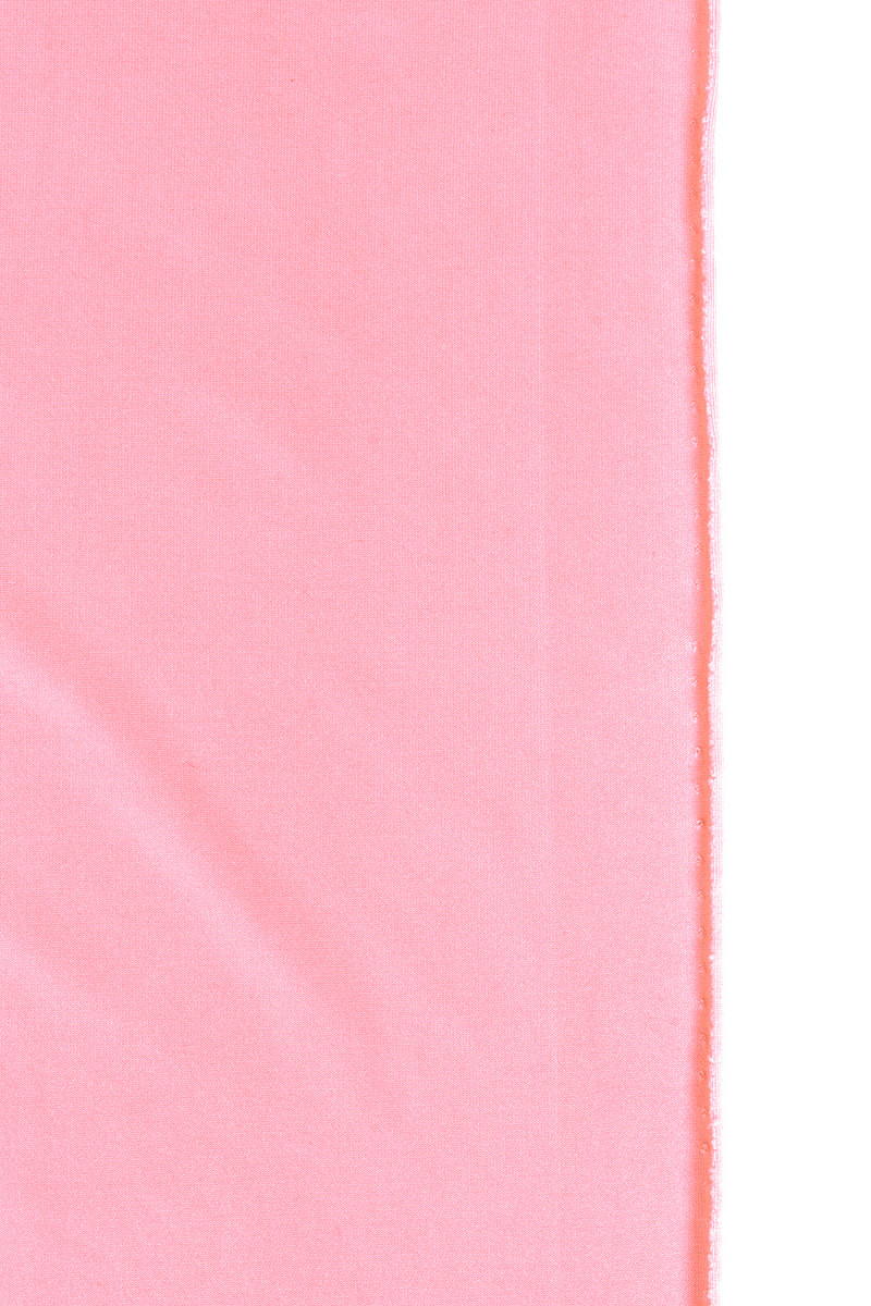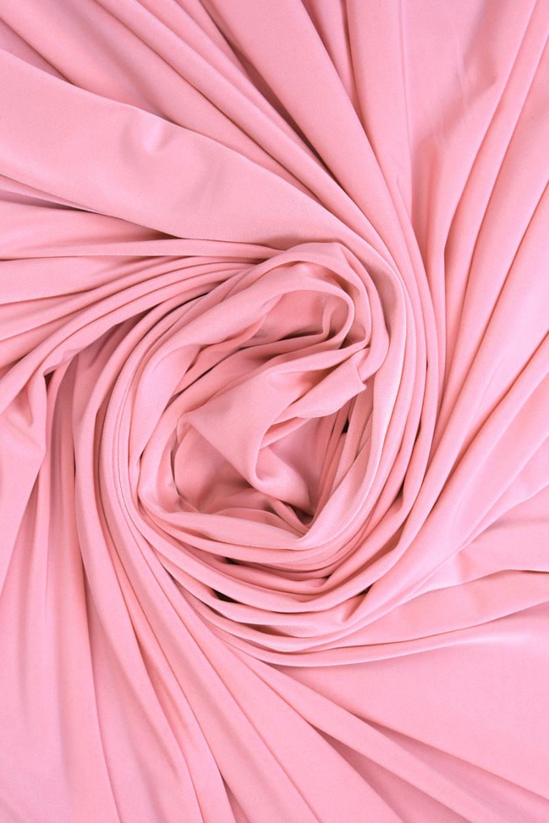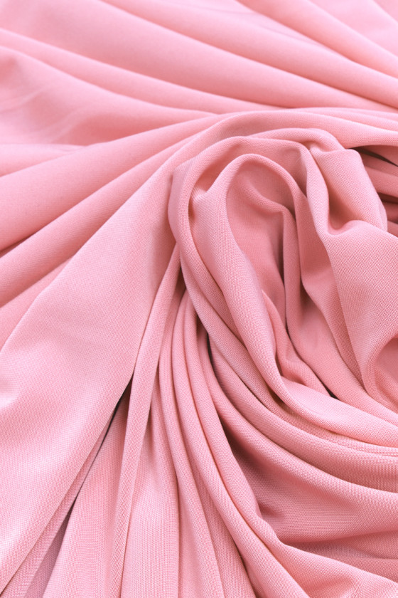 Włoska dzianina poliestrowa w kolorze różowym. Dzianina o zwartym, gładkim splocie, elastyczna w dwie strony, lekko błyszcząca z prawej strony.