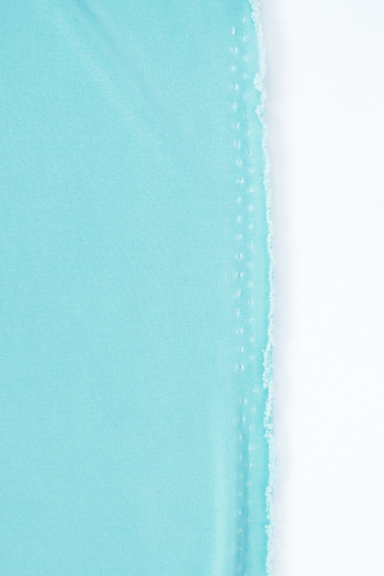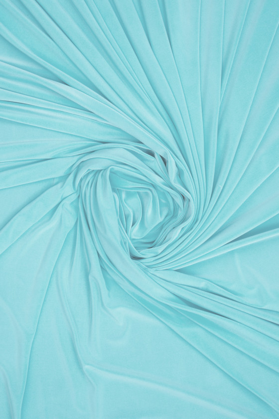 Włoska dzianina poliestrowa w kolorze jasnego turkusu. Dzianina o zwartym, gładkim splocie, elastyczna w dwie strony, lekko błyszcząca z prawej strony.