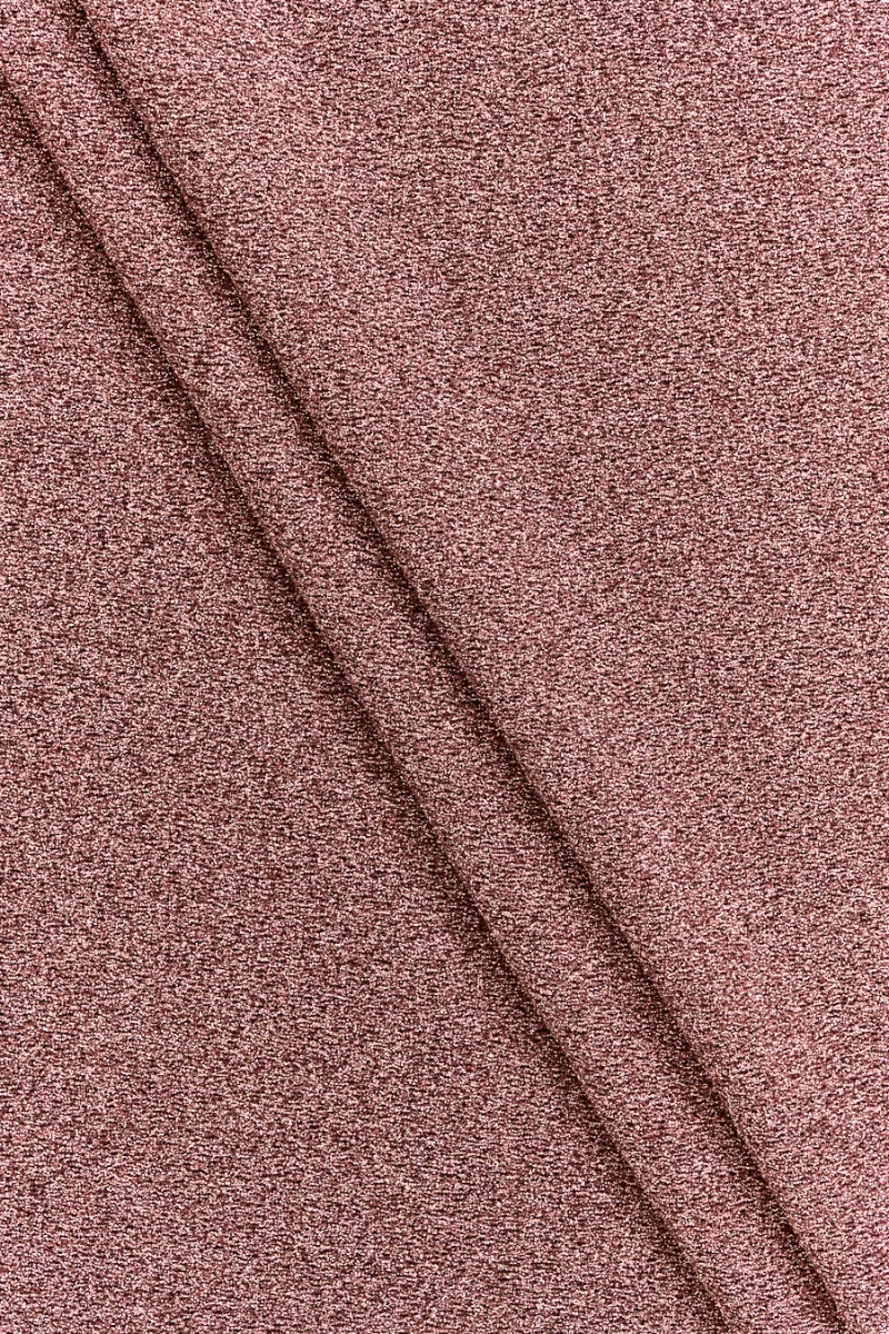 Włoska dzianina poliestrowa w kolorze miedzianym z kroplą różu, z nitką lureksową o splocie żorżetowym. Tkanina lekko elastyczna, kryjącą, bardzo efektowna, miedziana nitka tworzy lekko wypukłą strukturę. Idealna propozycja na bluzki, sukienki, spódnice o charakterze wyjściowym a także scenicznym.